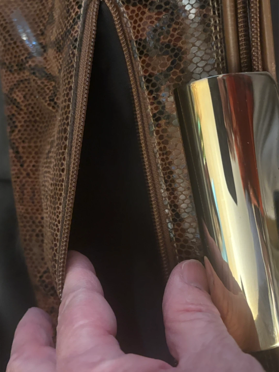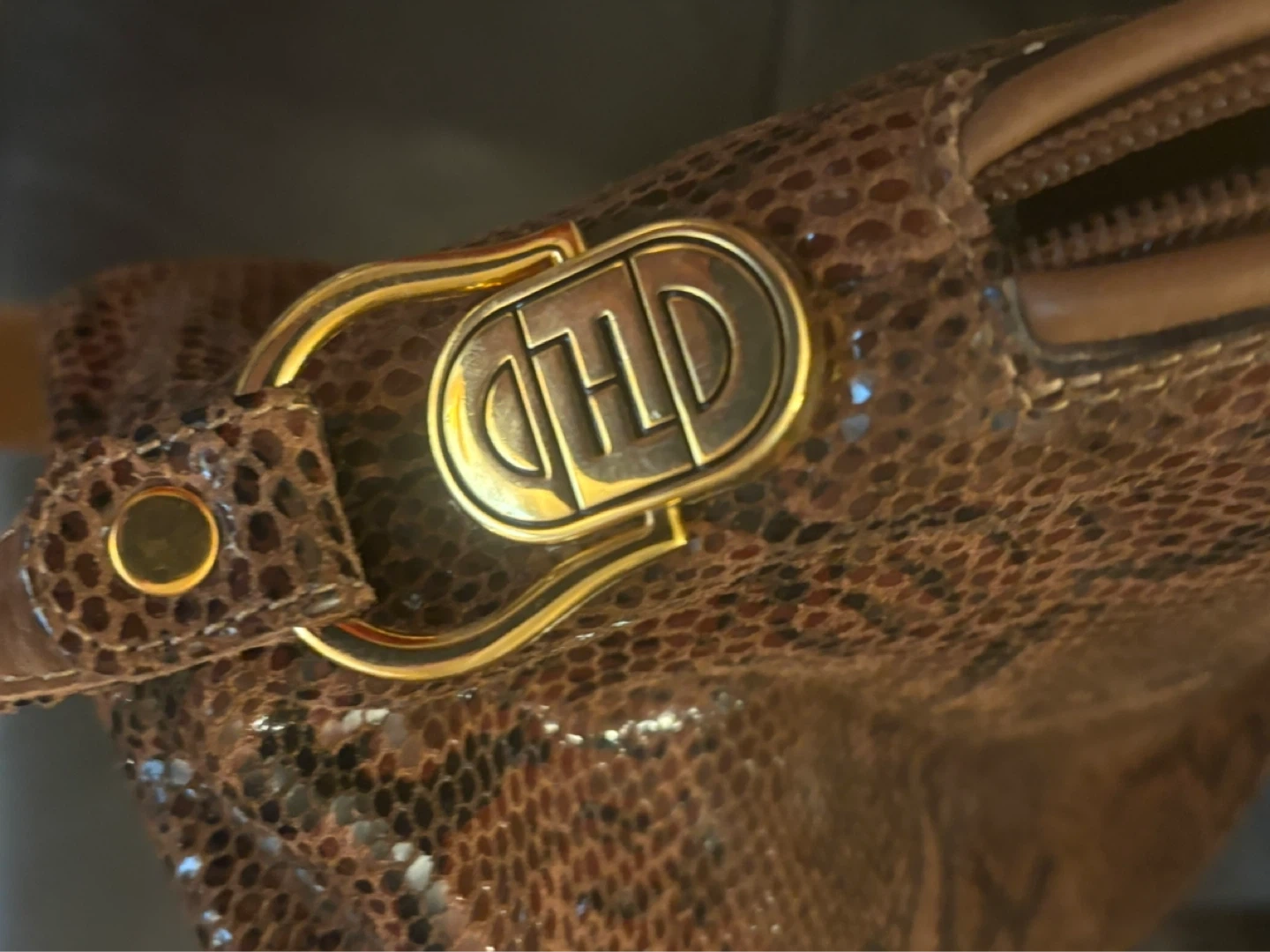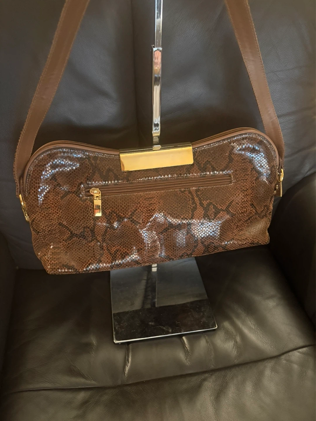 Stylish shoulder bag featuring a brown snake print exterior with a gold-tone clasp. It's made from genuine leather and was made in Canada. Inside, it has a zippered pocket and one slip pocket.