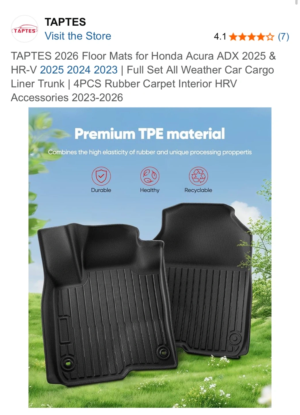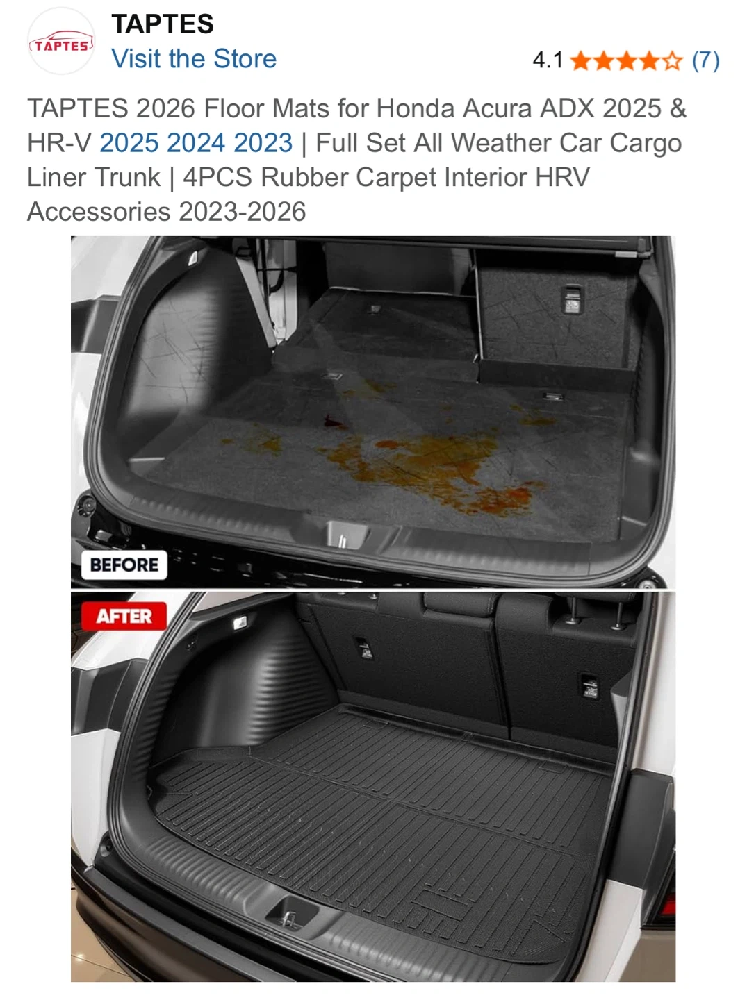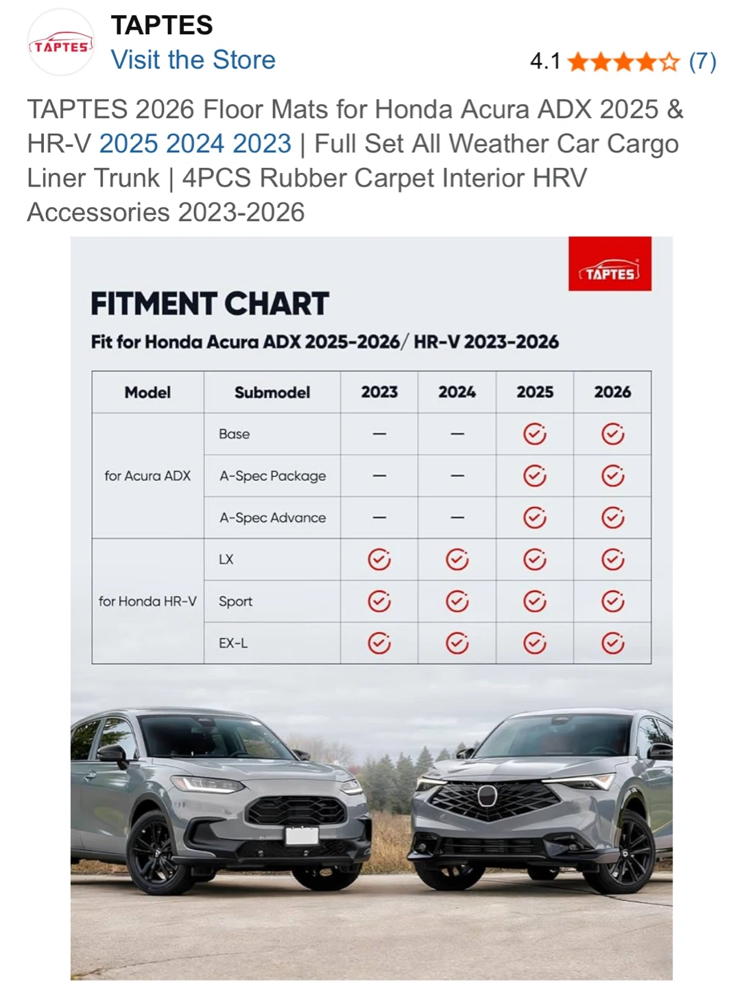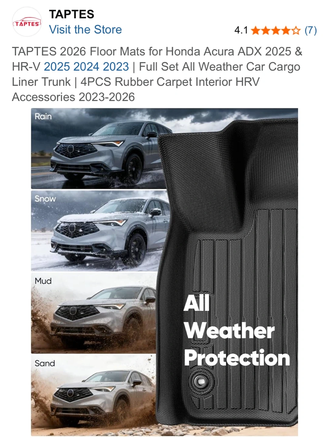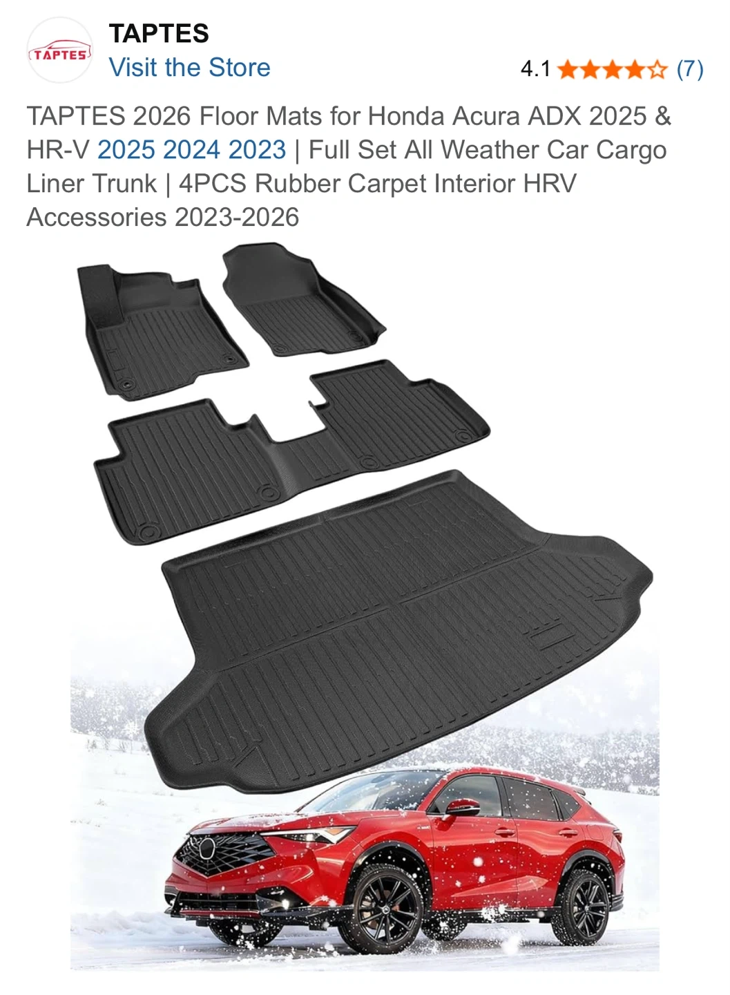 This is a 4-piece set of Taptes all-weather floor mats and a trunk liner. They're made from rubber carpet for interior protection. Designed for Honda Acura ADX (2025-2026) and Honda HR-V (2023-2026) models.