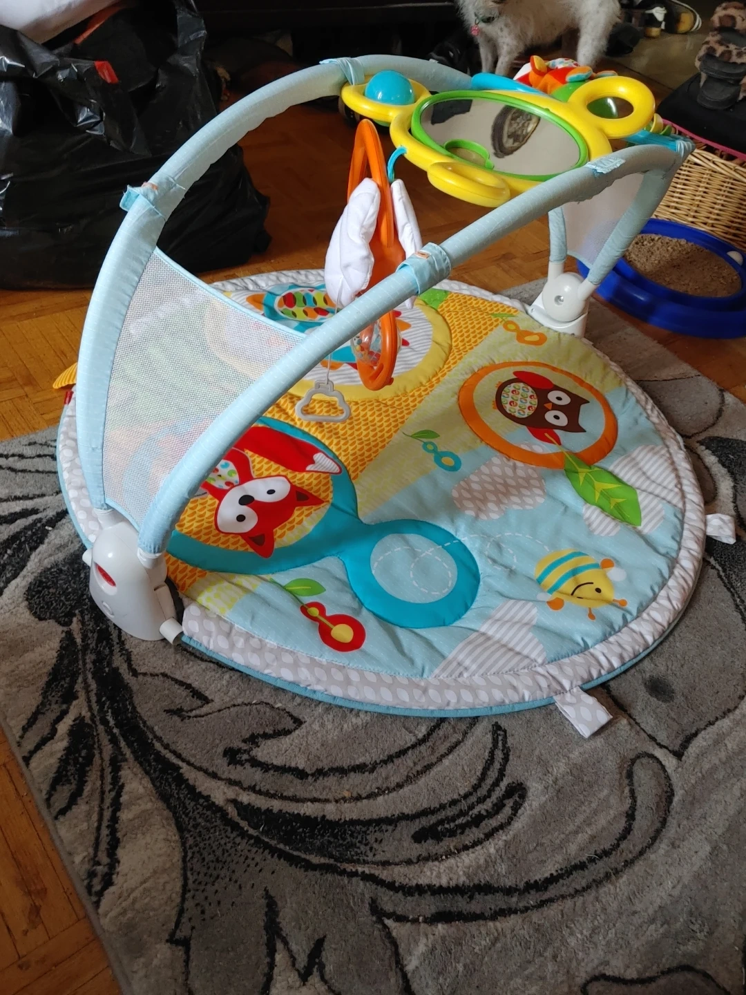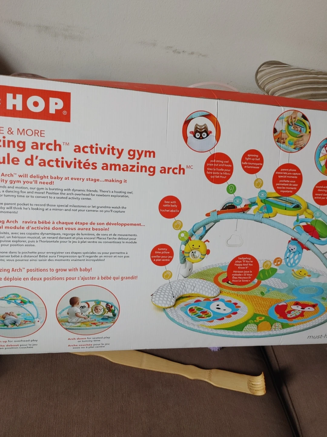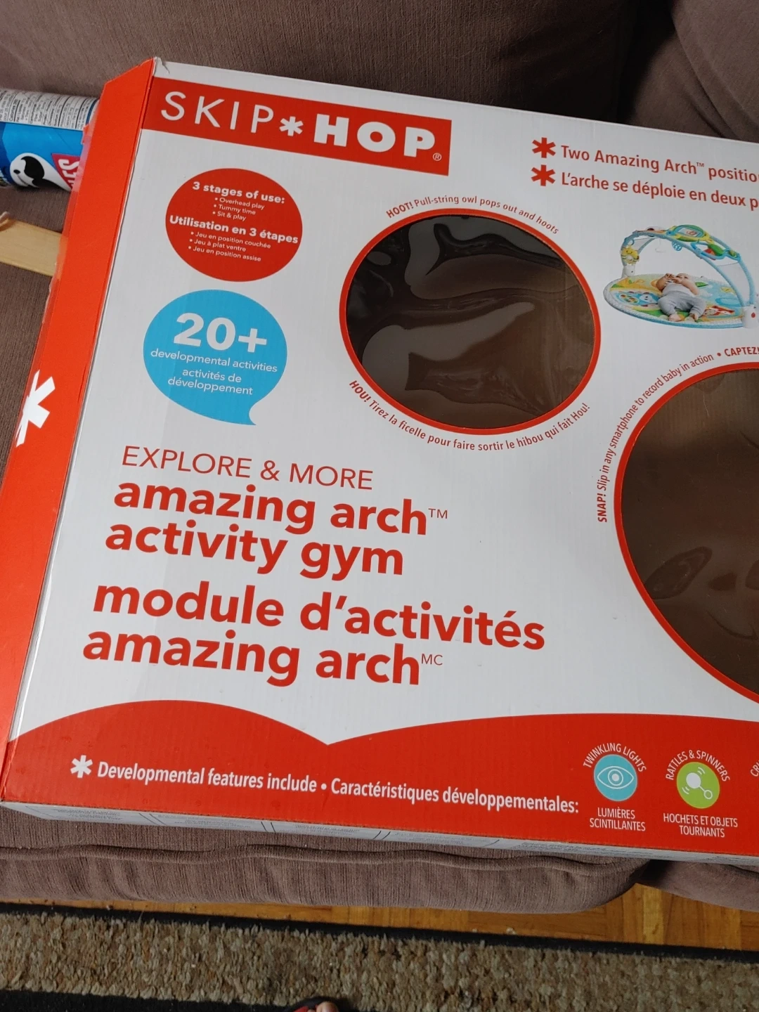 It's a Skip Hop Explore & More Amazing Arch activity gym with 20+ developmental activities. Features include a baby-safe mirror, musical and sound toys, and pull-string owl pops. Recommended for ages 0-12 months.missing 2 stuffies so im giving a little bath book
