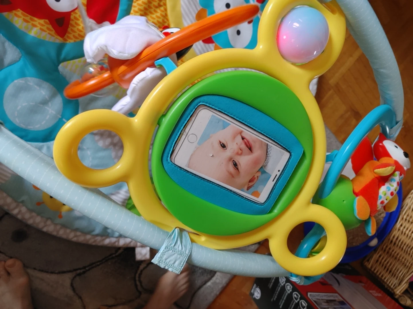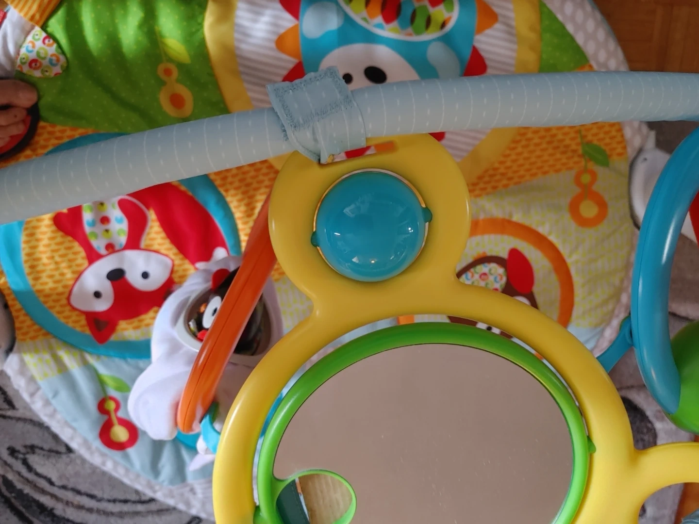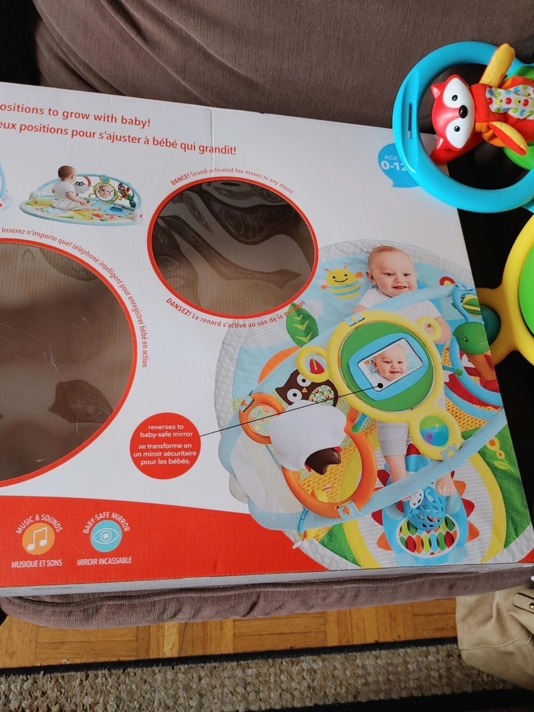 It's a Skip Hop Explore & More Amazing Arch activity gym with 20+ developmental activities. Features include a baby-safe mirror, musical and sound toys, and pull-string owl pops. Recommended for ages 0-12 months.missing 2 stuffies so im giving a little bath book