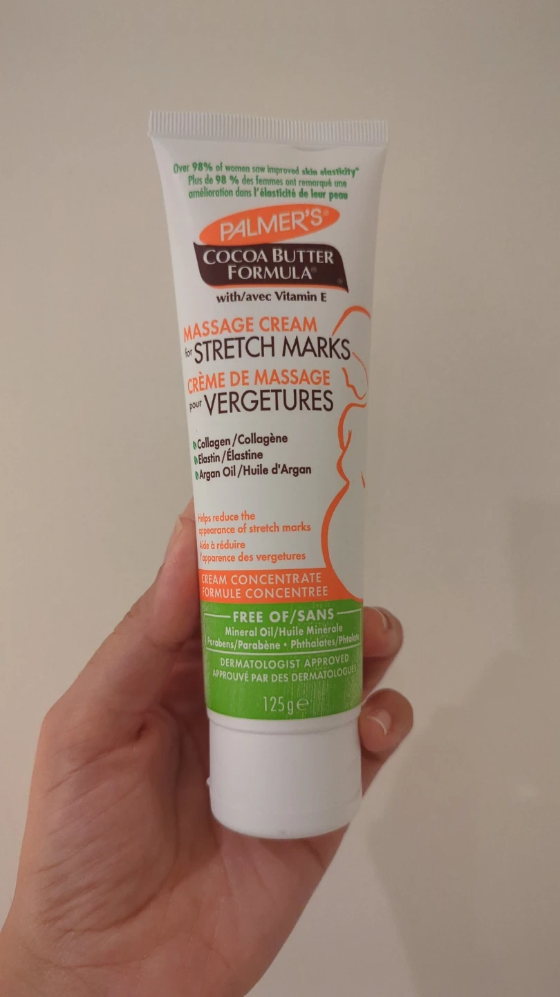 Palmer's Cocoa Butter Formula Massage Cream for Stretch Marks with Vitamin E. It's a cream concentrate with collagen, elastin, and argan oil. This formula is free of mineral oil, parabens, and phthalates. Dermatologist approved.