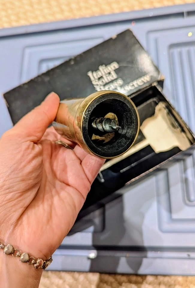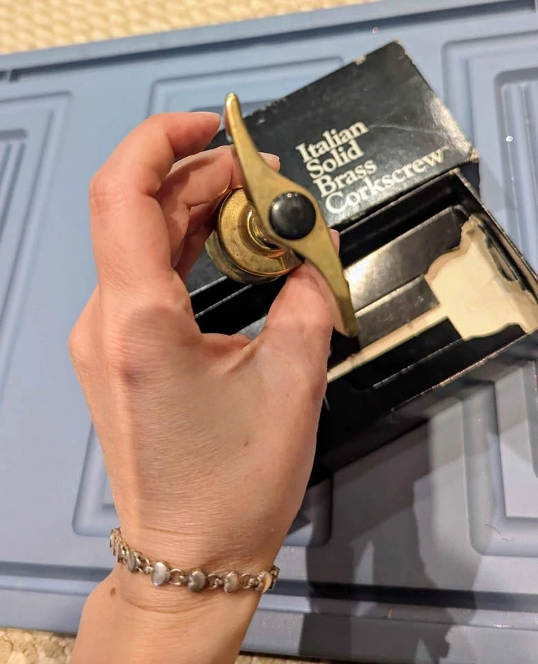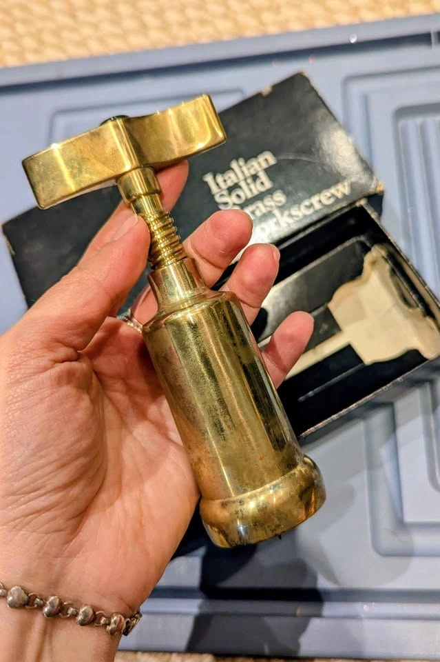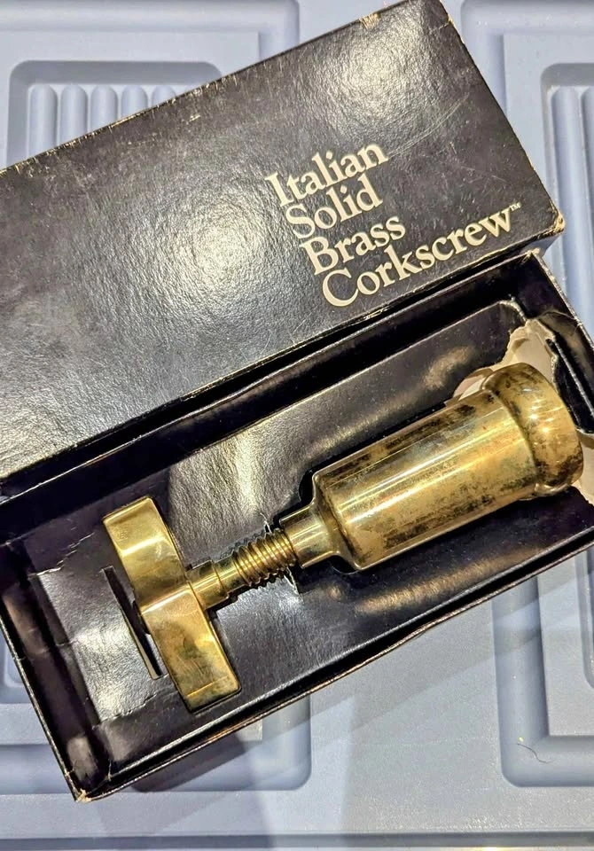 Found this beautiful Italian solid brass corkscrew and it honestly feels like something from an old-school wine bar! Heavy, solid brass (Made in Italy). Smooth mechanical design – super satisfying to use. Has a natural vintage patina or could be polished to shine. Comes with original box. It’s one of those pieces that actually makes opening a bottle feel like a moment instead of a task... Perfect for wine lovers, home bar setups, or vintage/aesthetic decor.