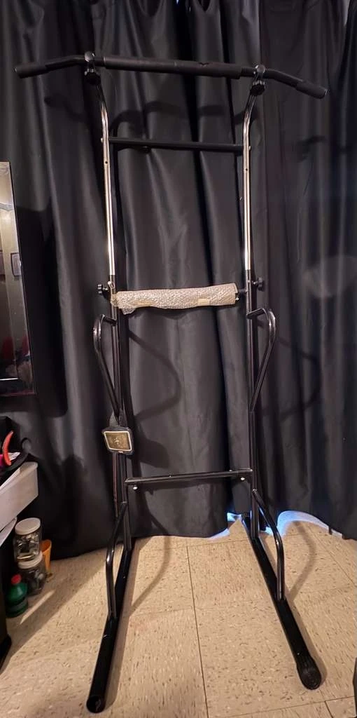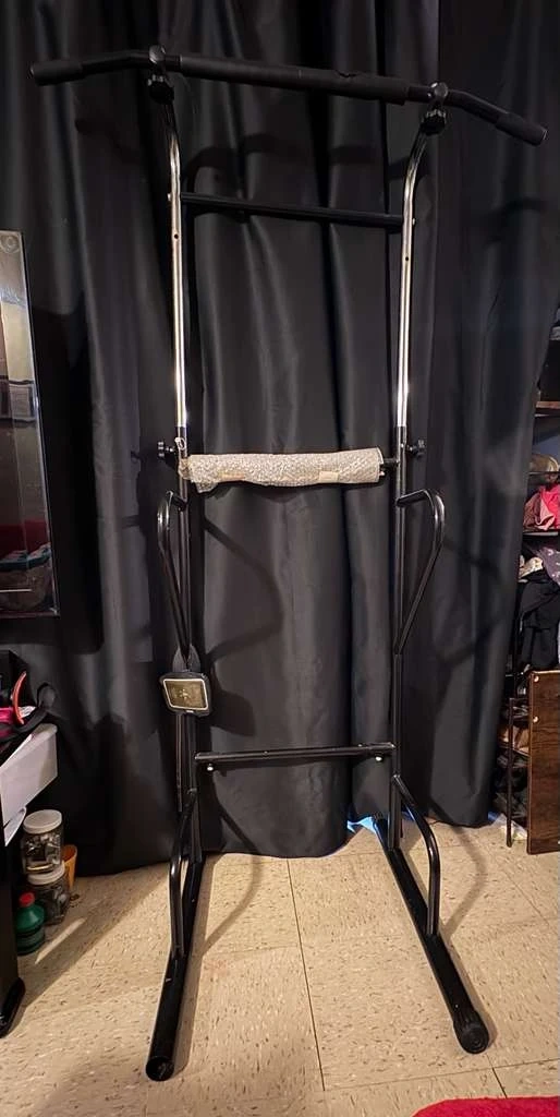 This is a multi-functional pull-up and dip station for home workouts. It features a sturdy metal frame with padded grips. Great for building upper body strength!