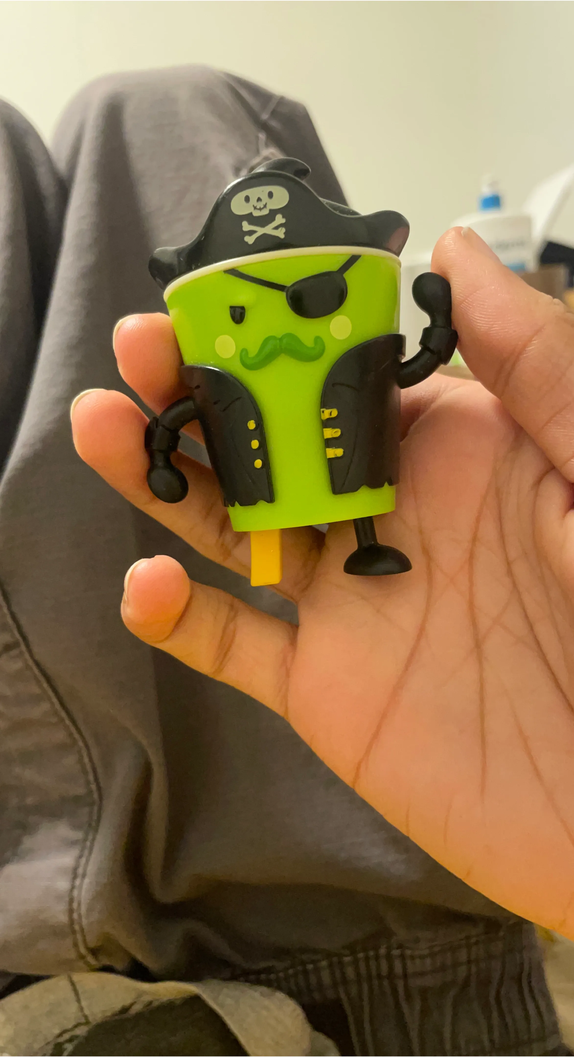 Selling a cute pirate character toy figure! It's green and has a pirate hat, eye patch, and a cool little jacket. Perfect for kids or collectors!