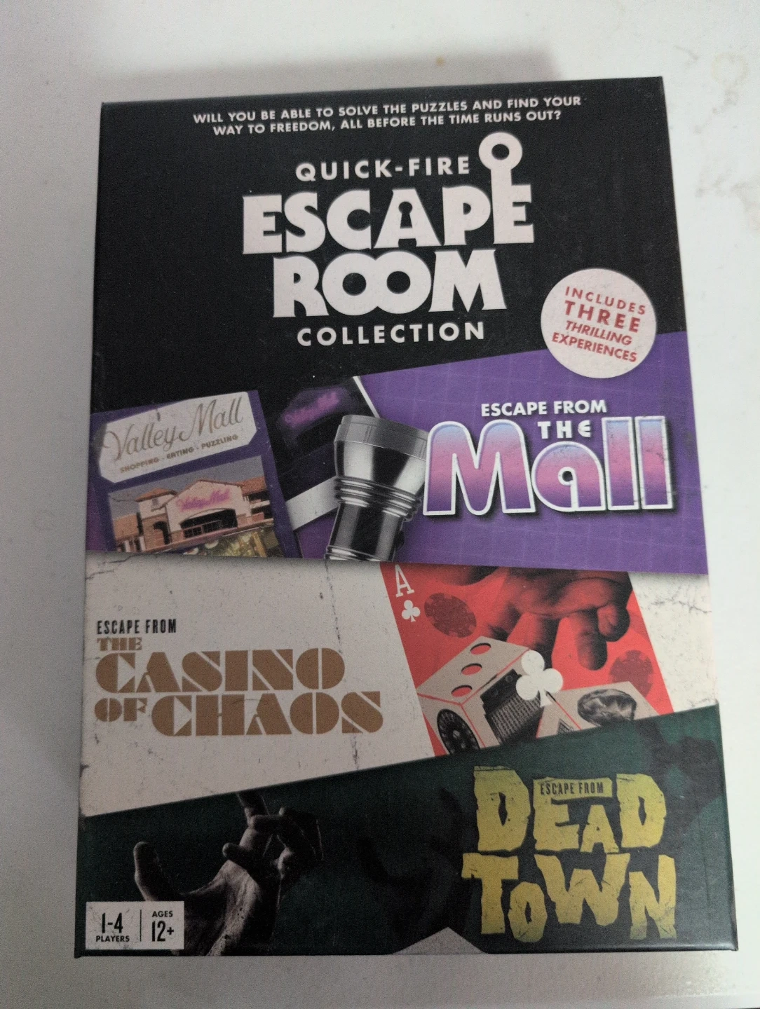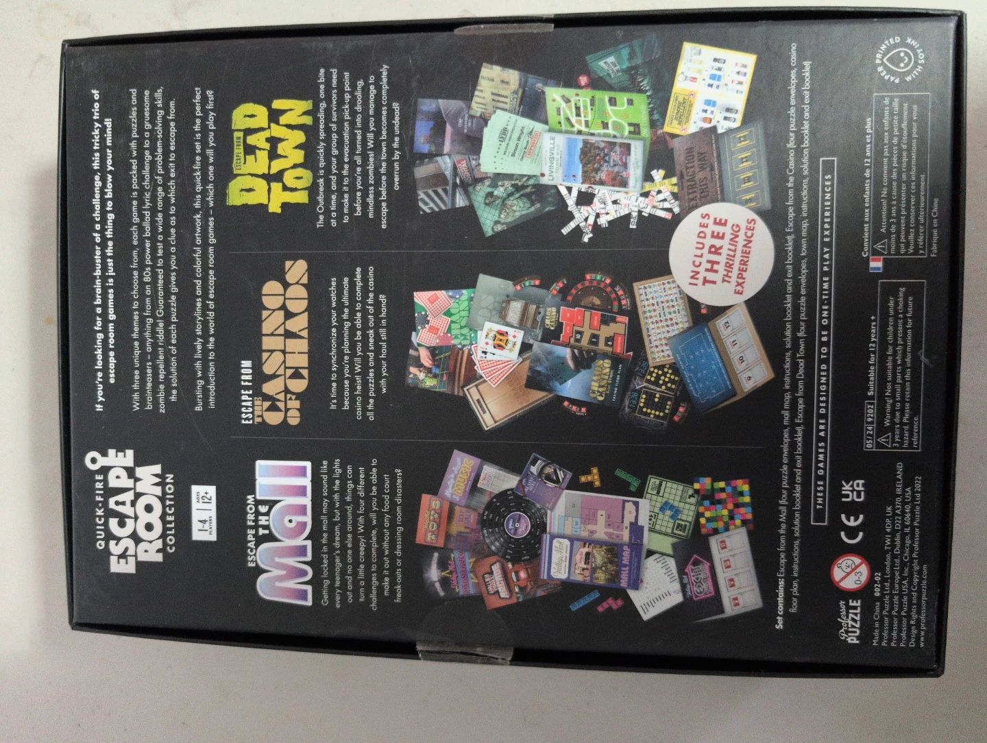 This box includes three thrilling escape room experiences: Escape from the Mall, Escape from the Casino of Chaos, and Escape from Dead Town. Designed for 1-4 players, ages 12 and up. Enjoy brain-buster challenges and puzzles with this collection!