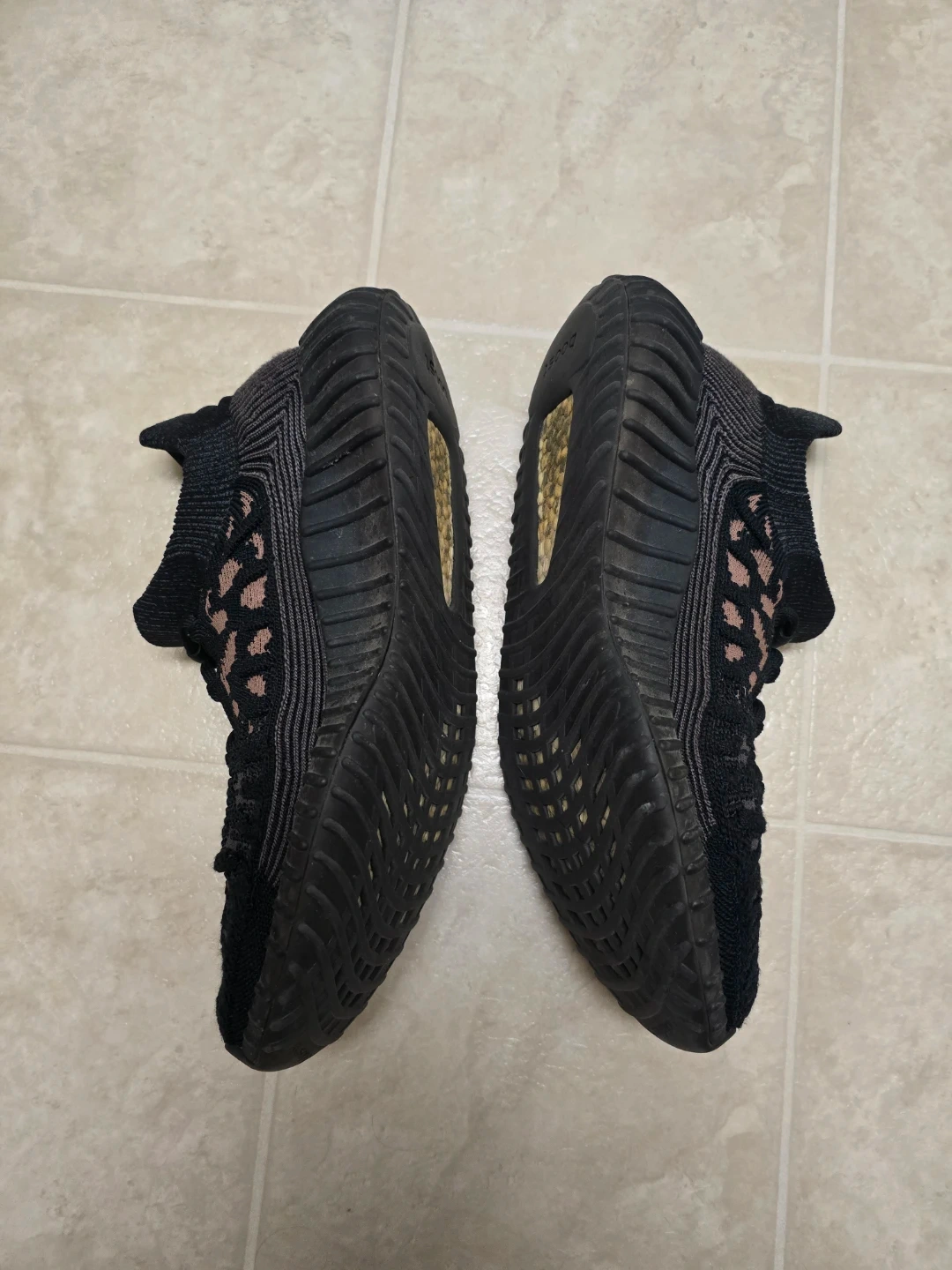 Black knit Adidas Yeezy Boost V2 CMPCT sneakers. Features a pull-tab heel and "boost" sole technology. These are used and in a size 10.5