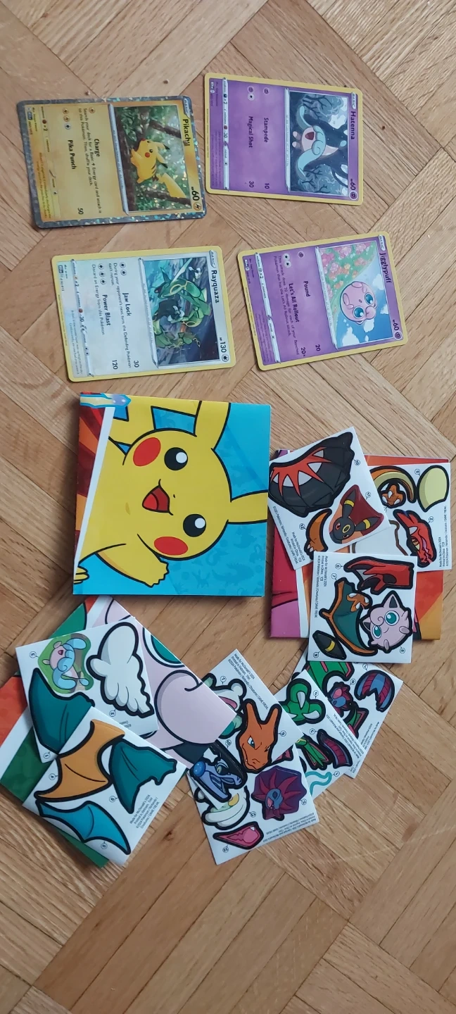 Includes a Pikachu, Rayquaza, Hatenna, and Jigglypuff Pokémon trading card. Also comes with assorted Pokémon stickers, featuring characters like Charizard and Umbreon. Great for any Pokémon fan!