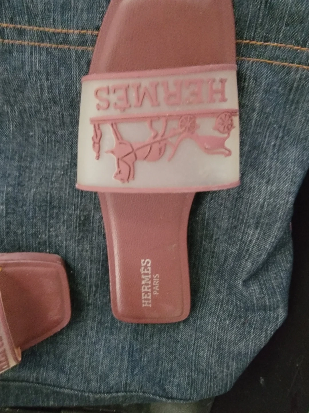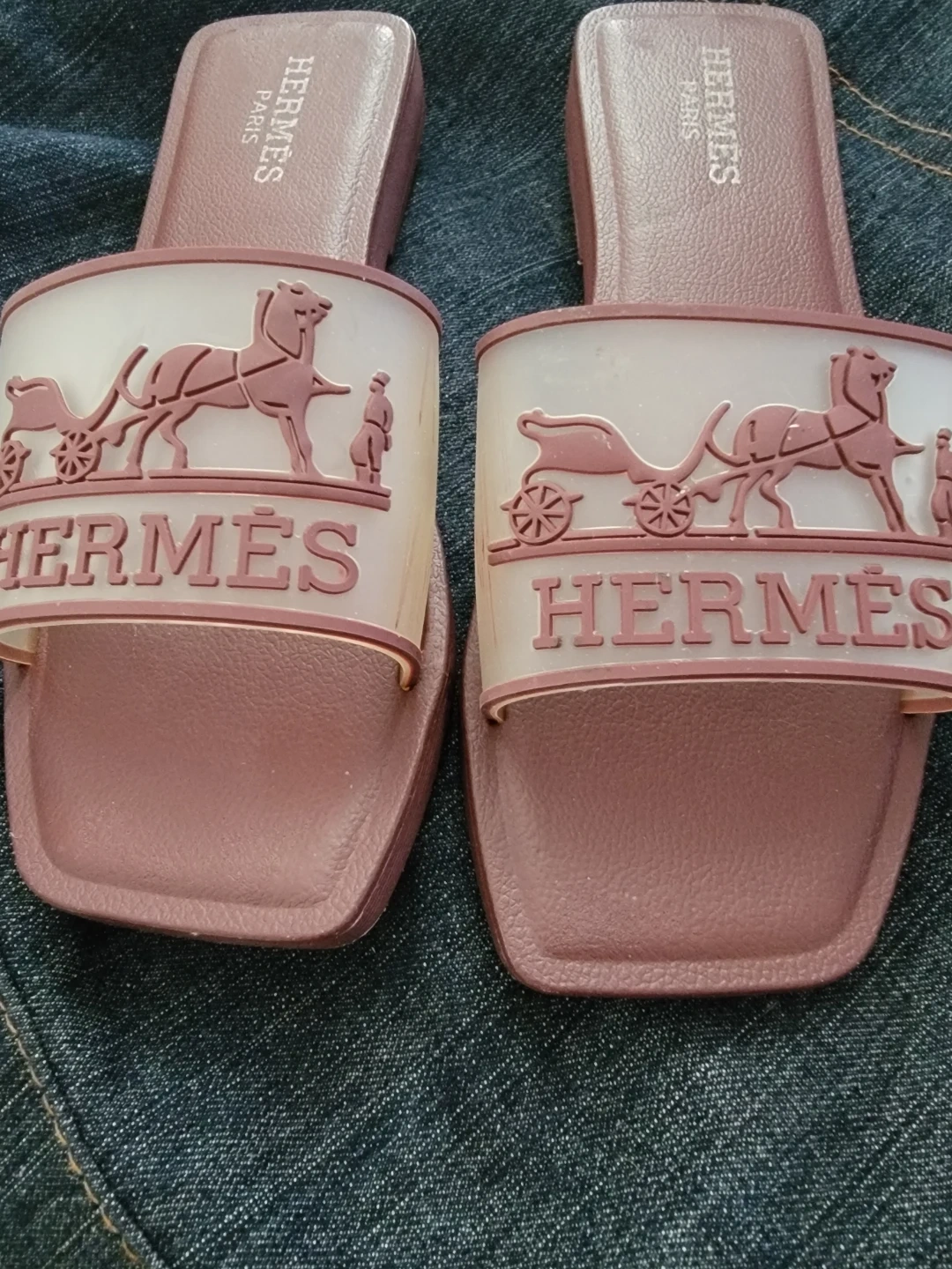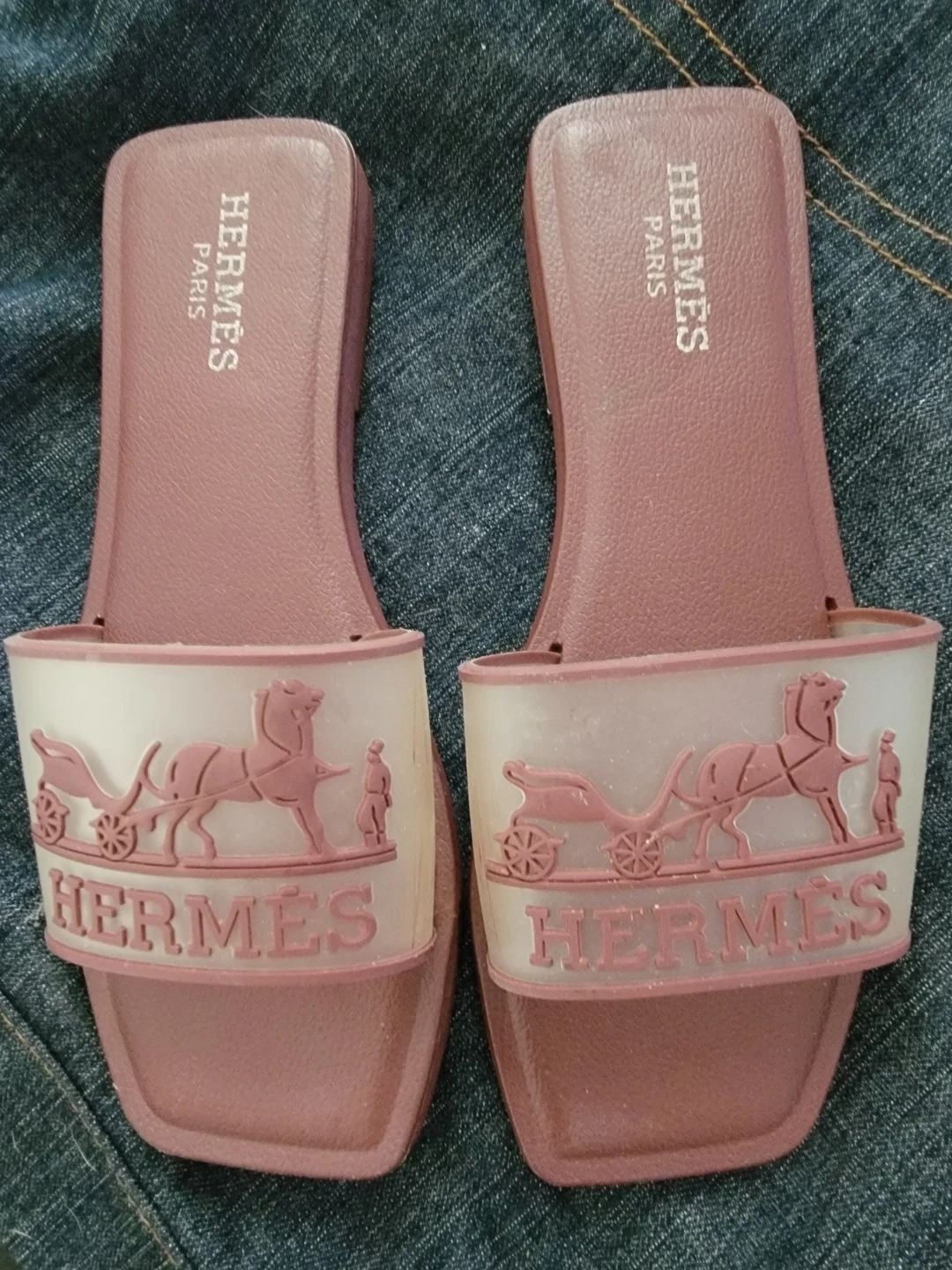 Hermès Paris slides with the iconic horse and carriage logo. These stylish sandals are a pretty dusty rose colour with a translucent white strap. Perfect for a casual day out!