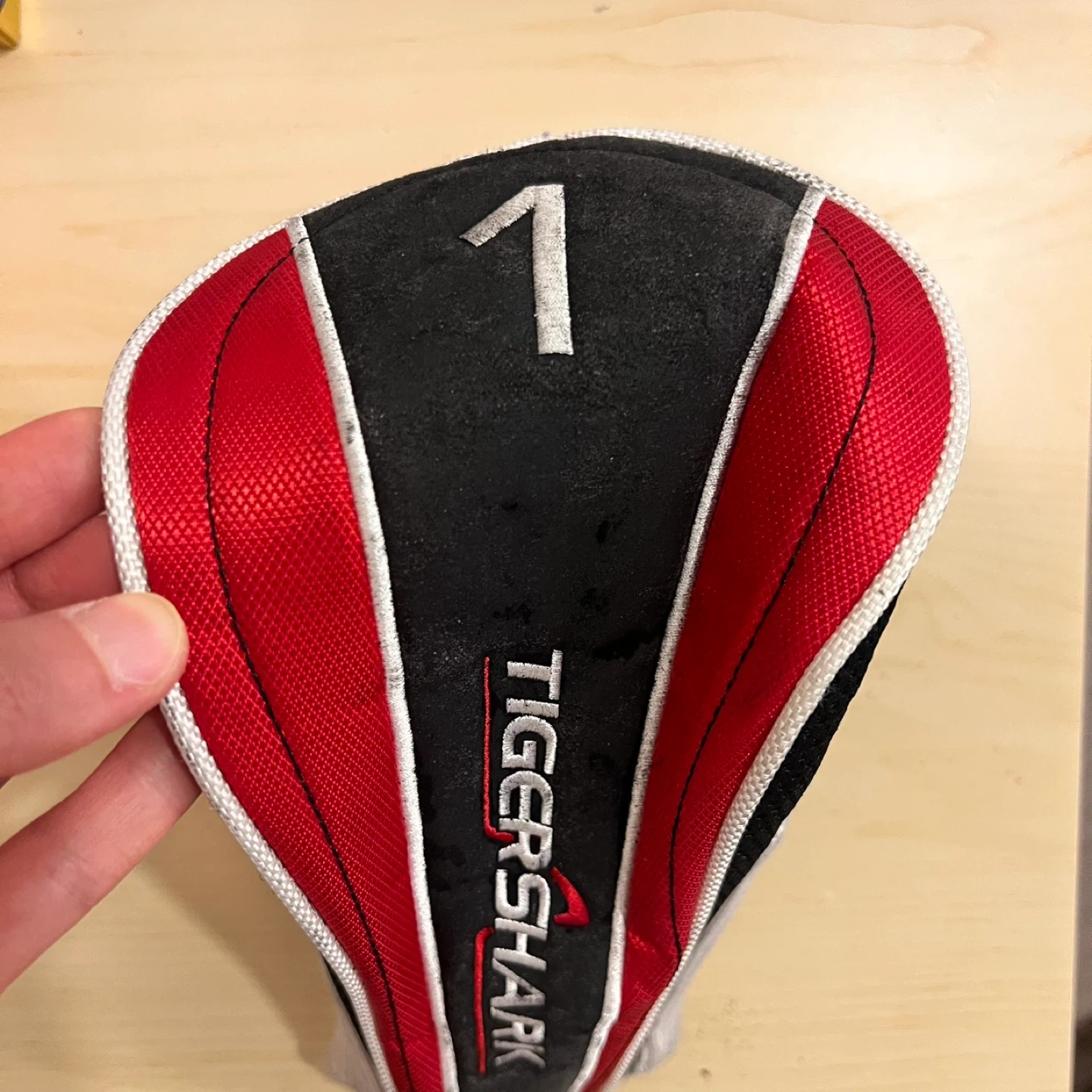This is a Tiger Shark golf club headcover, marked with a '1'. It's designed to protect your clubs on the course. The headcover is made of a durable material with red and black accents.