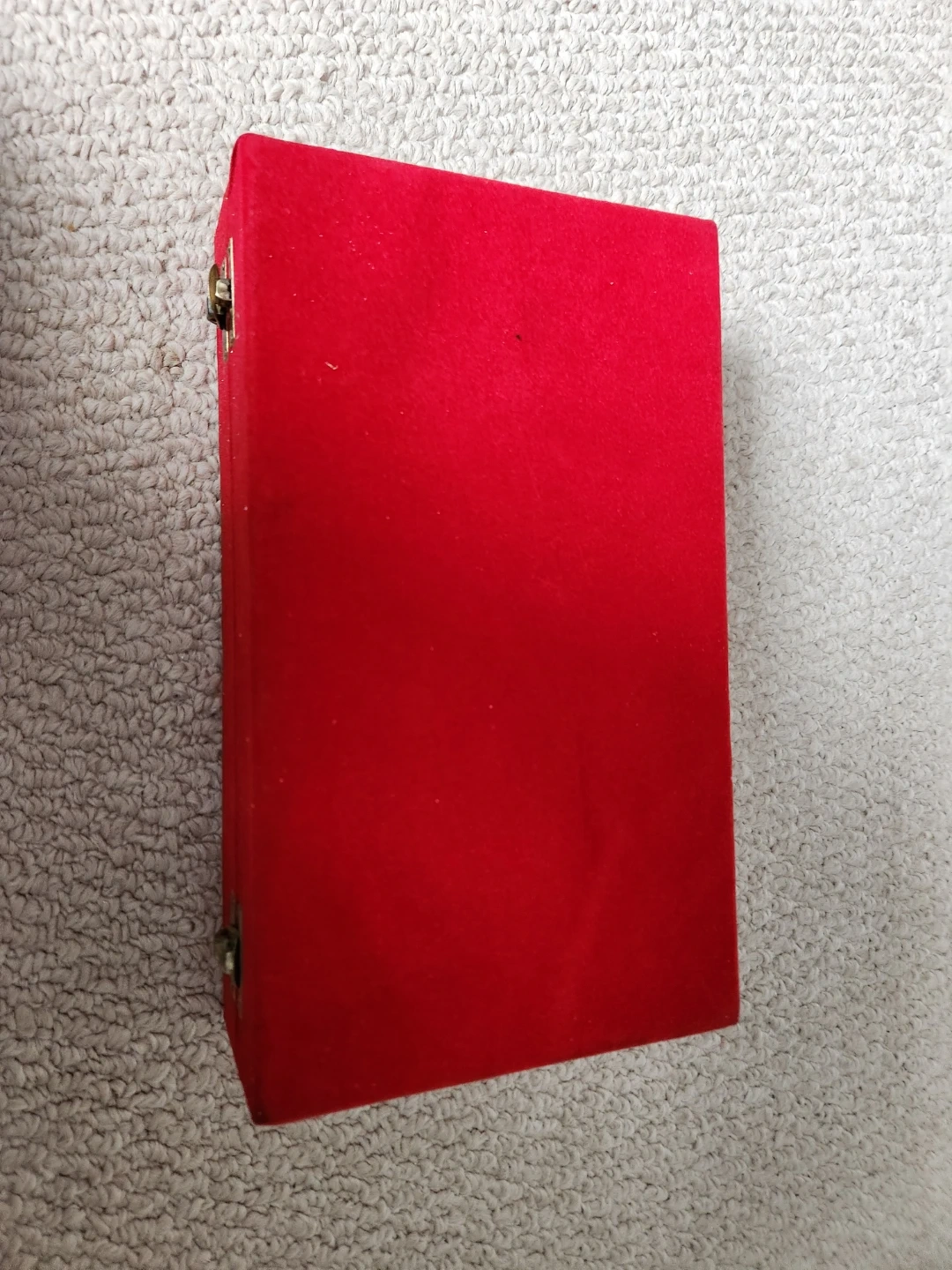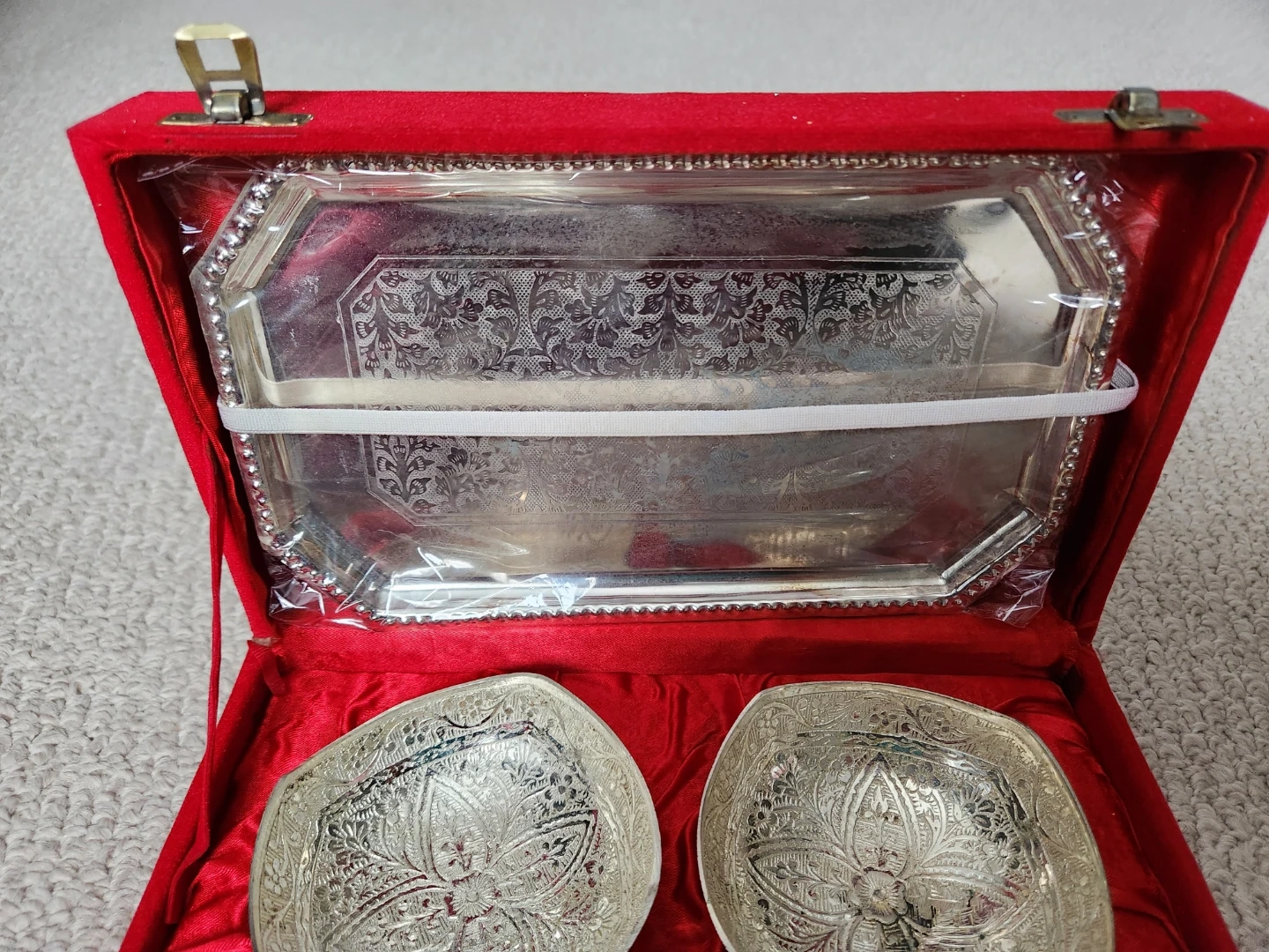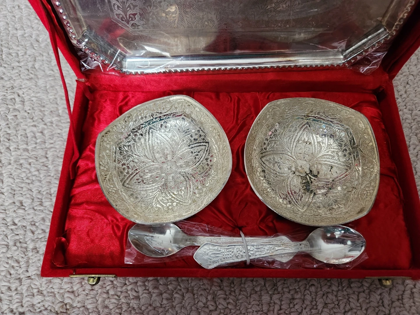 This set includes two ornate, silver-plated decorative bowls and a matching tray, along with two spoons. The items are presented in a red velvet-lined case. They feature intricate embossed floral patterns.