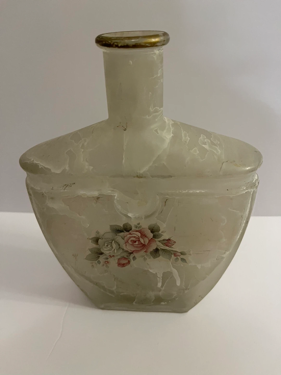 Frosted glass bottle with a delicate rose decal. It has a gold-toned rim. This bottle's unique shape makes it a lovely decorative piece. Featuring floral