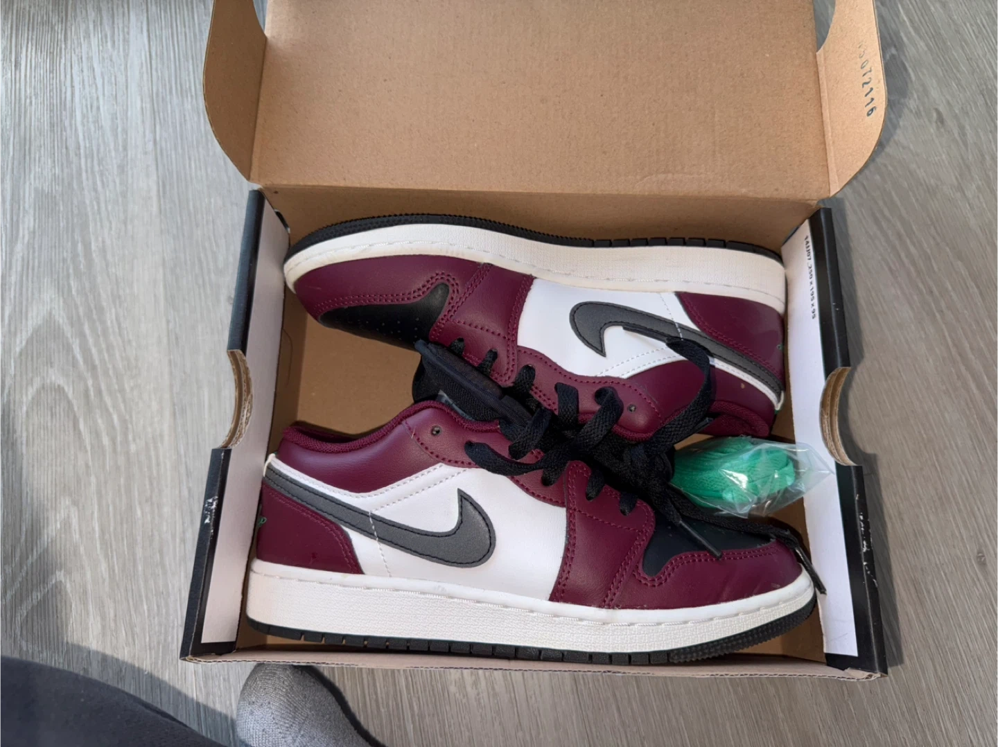 These Air Jordan 1 Lows come in a stylish burgundy, white, and black colourway. They feature a durable leather and synthetic upper. Includes extra green laces.