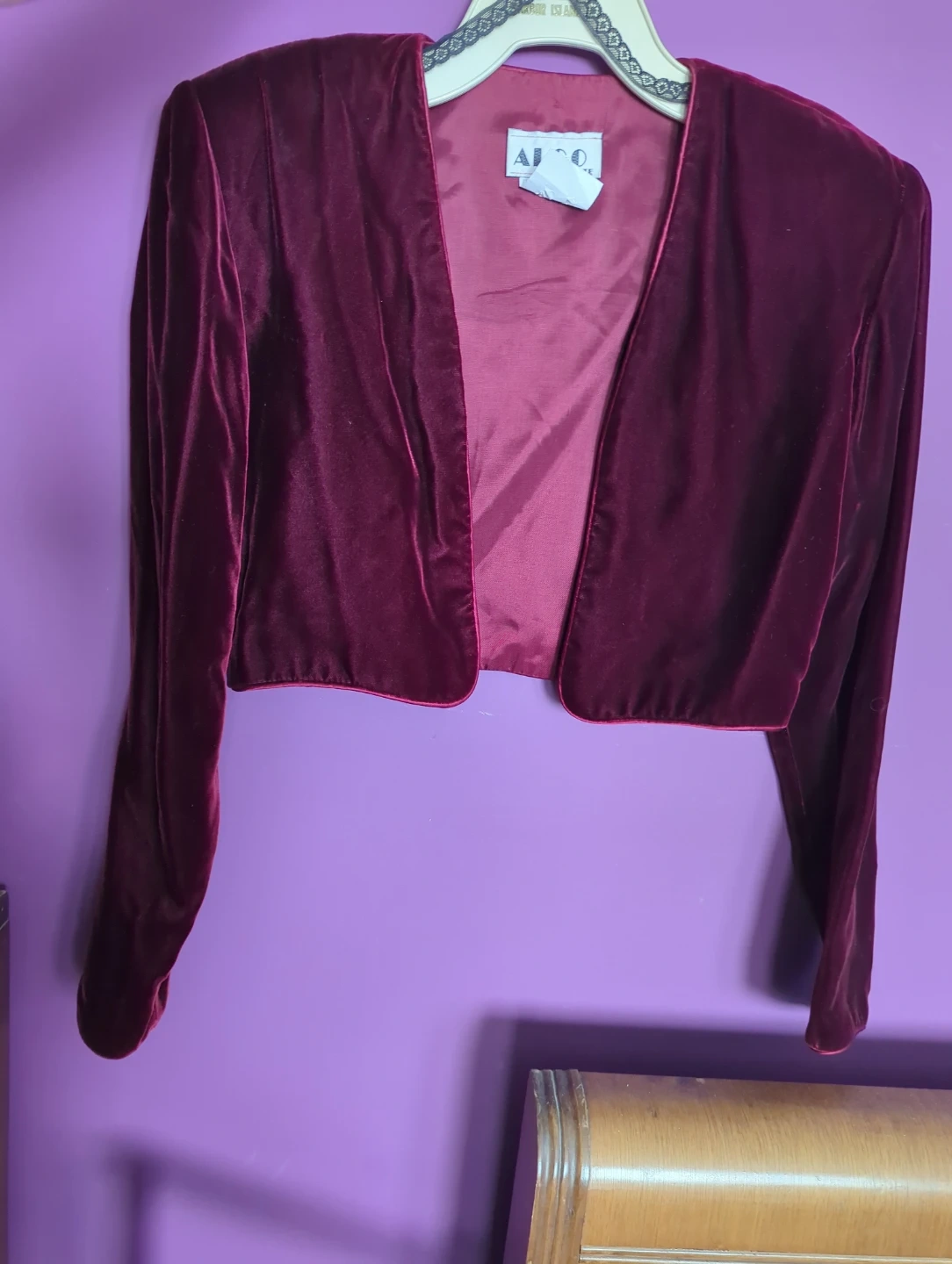 Velvet bolero jacket with long sleeves. Made from 75% rayon and 25% acetate. Features a satin lining. Great for dressing up an outfit!