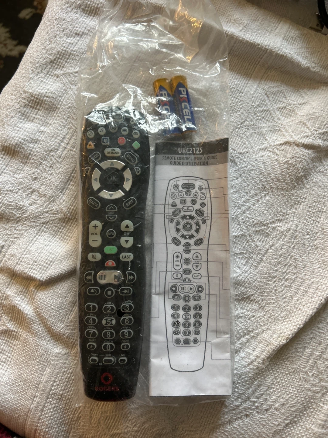 Includes a Rogers URC2125 universal remote control. Comes with a user's guide and two AA batteries. This remote is designed for easy operation of your entertainment system.