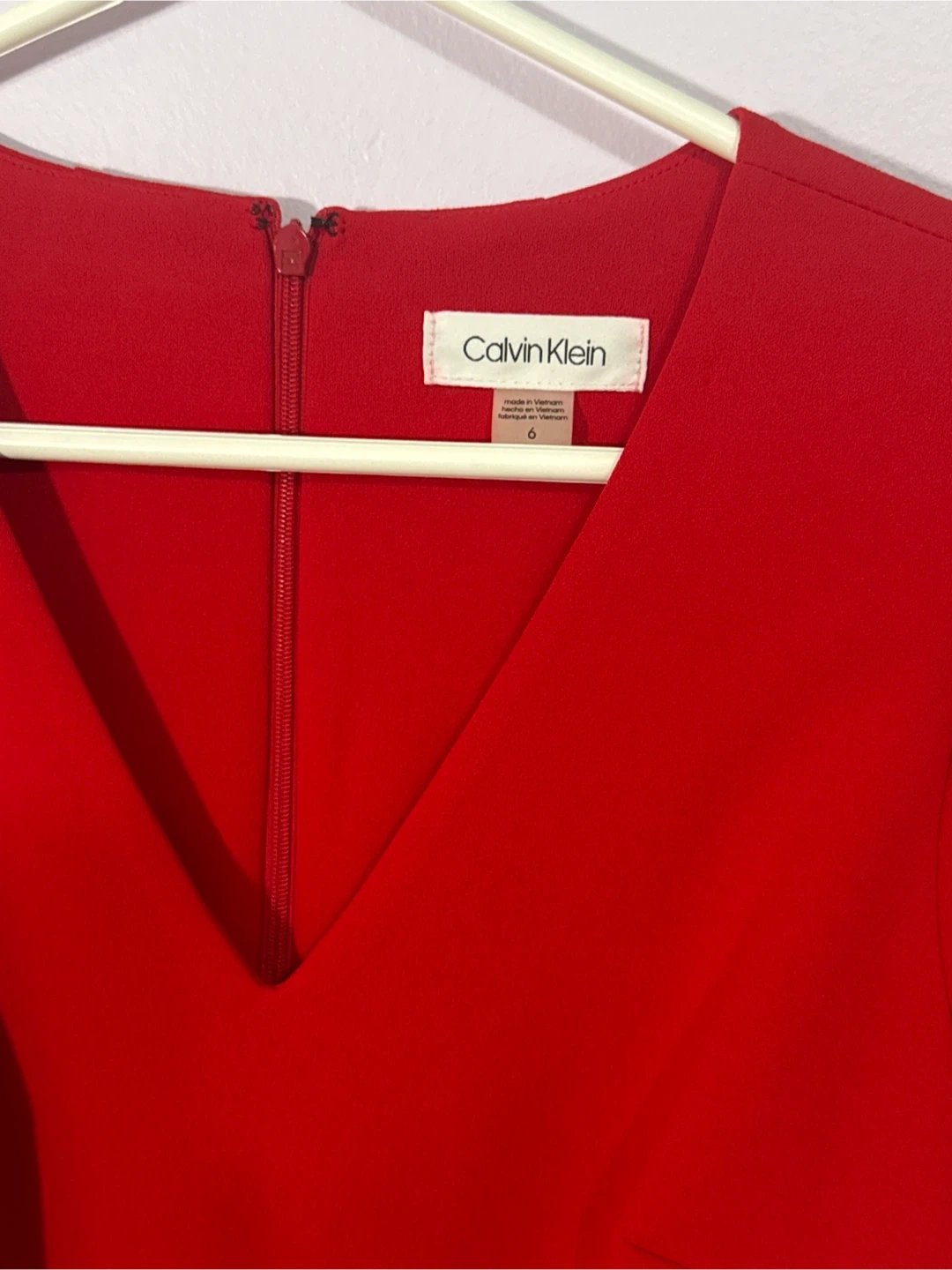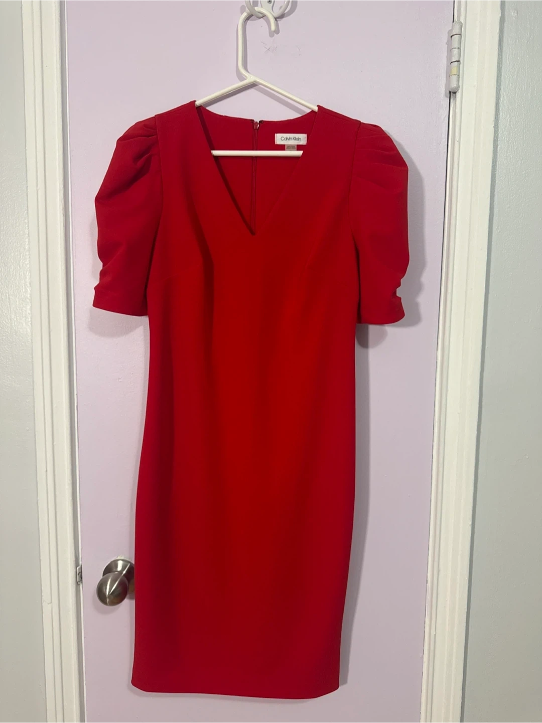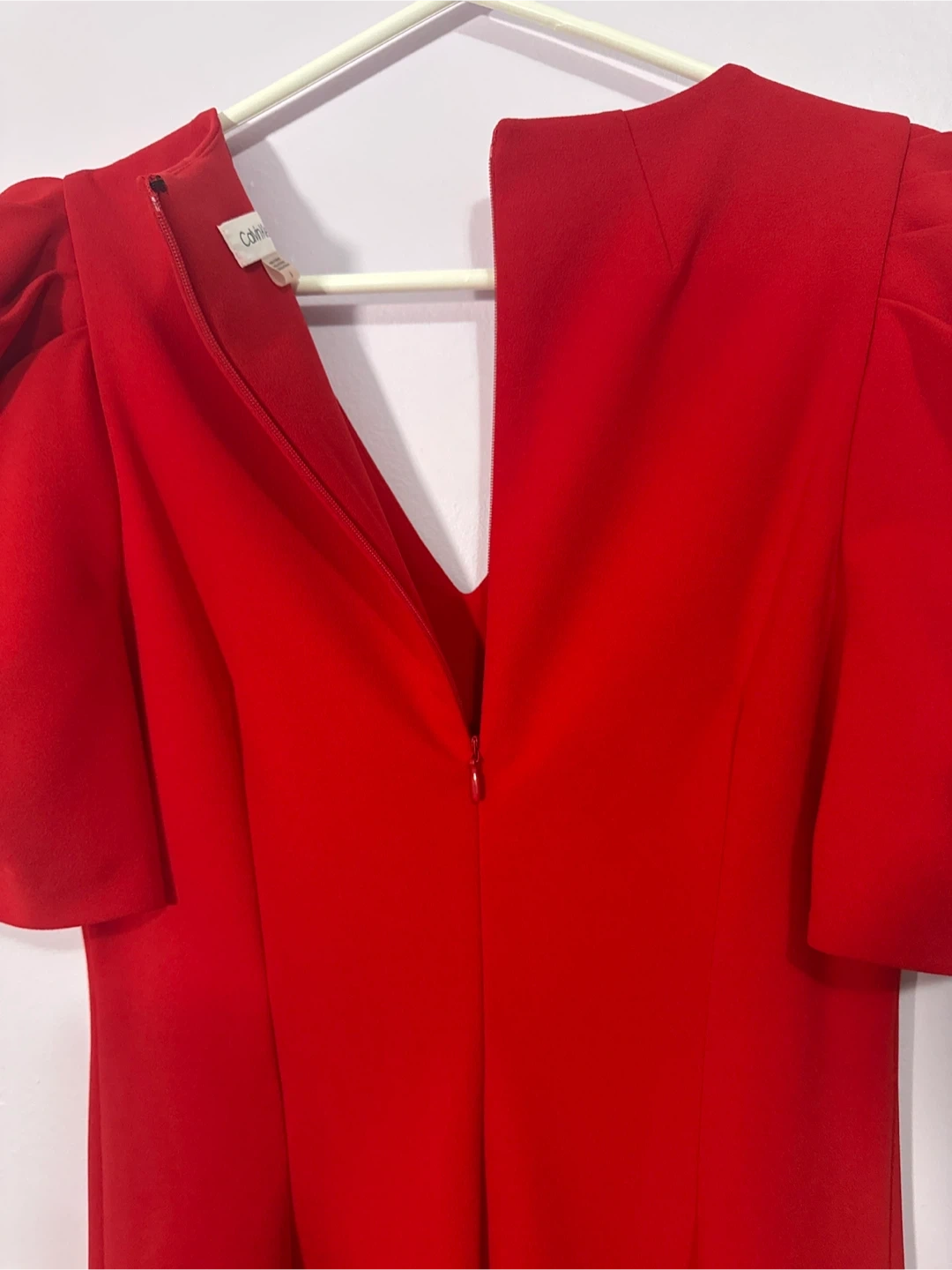 Calvin Klein sheath dress in a bold red colour. It features stylish puff sleeves and a flattering v-neckline. Back zipper closure. Size 6.