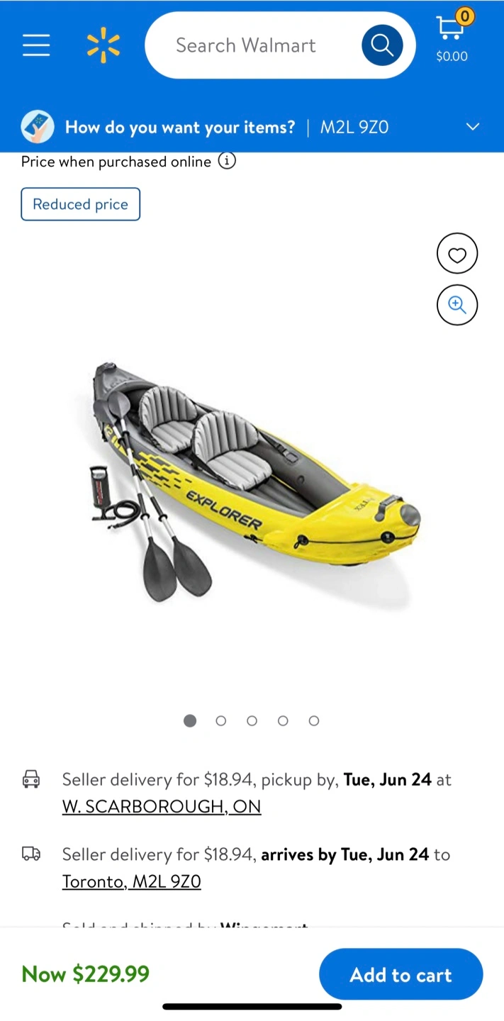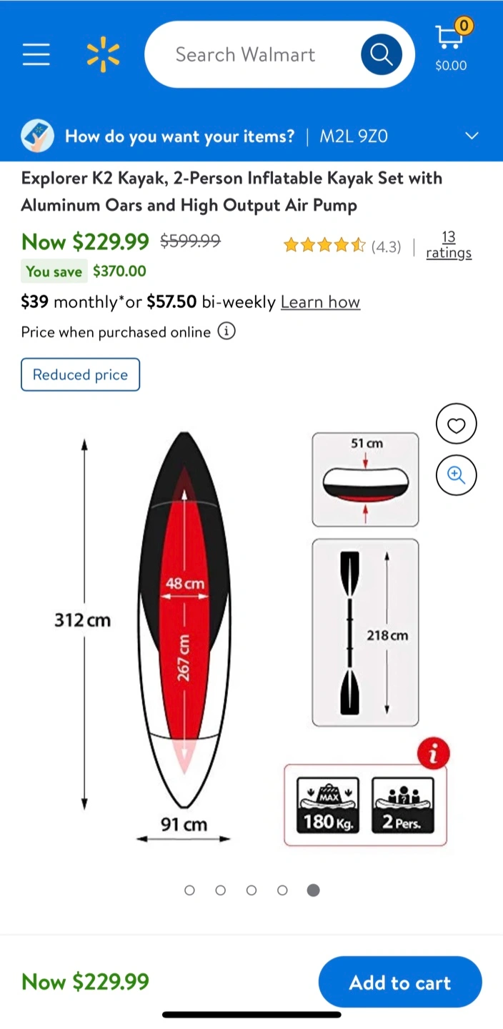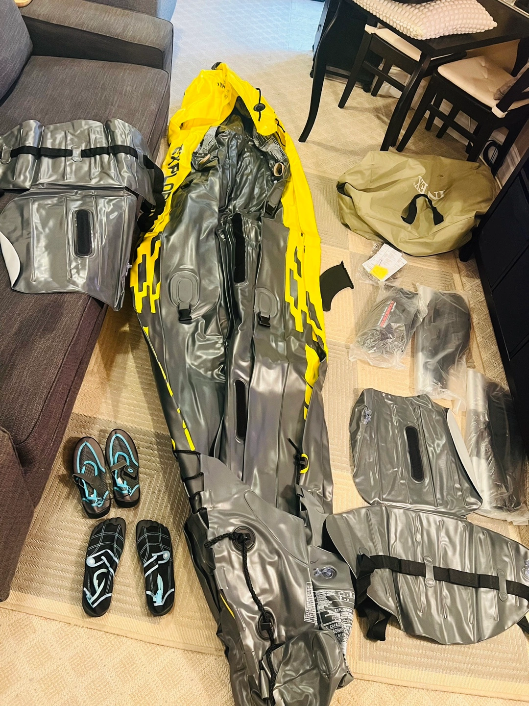 NEW- never used! Selling an Explorer K2 inflatable kayak set for two people! It comes with aluminum oars and a high-output air pump. The kayak is yellow and grey and can support up to 180kg. The set includes everything (except the water shoes). Sells at Walmart today at $263 (with taxes)