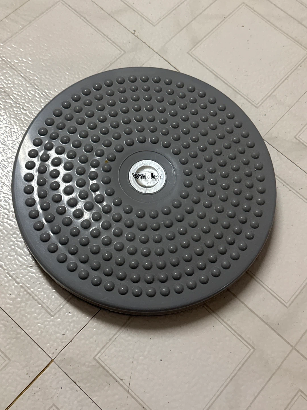 This is a grey Weider twist board for core workouts. It's made of durable plastic and has a textured surface for grip. Great for home exercise routines!
