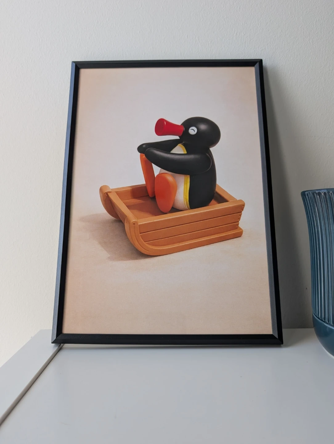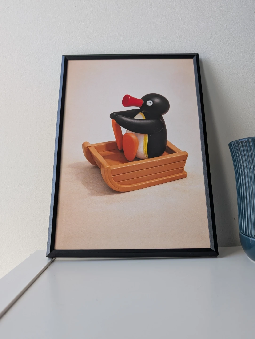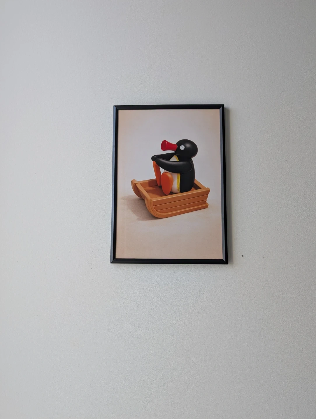 This framed print features the beloved character Pingu riding in a sled. It's a fun piece of art for any fan's collection. The print is housed in a black frame.