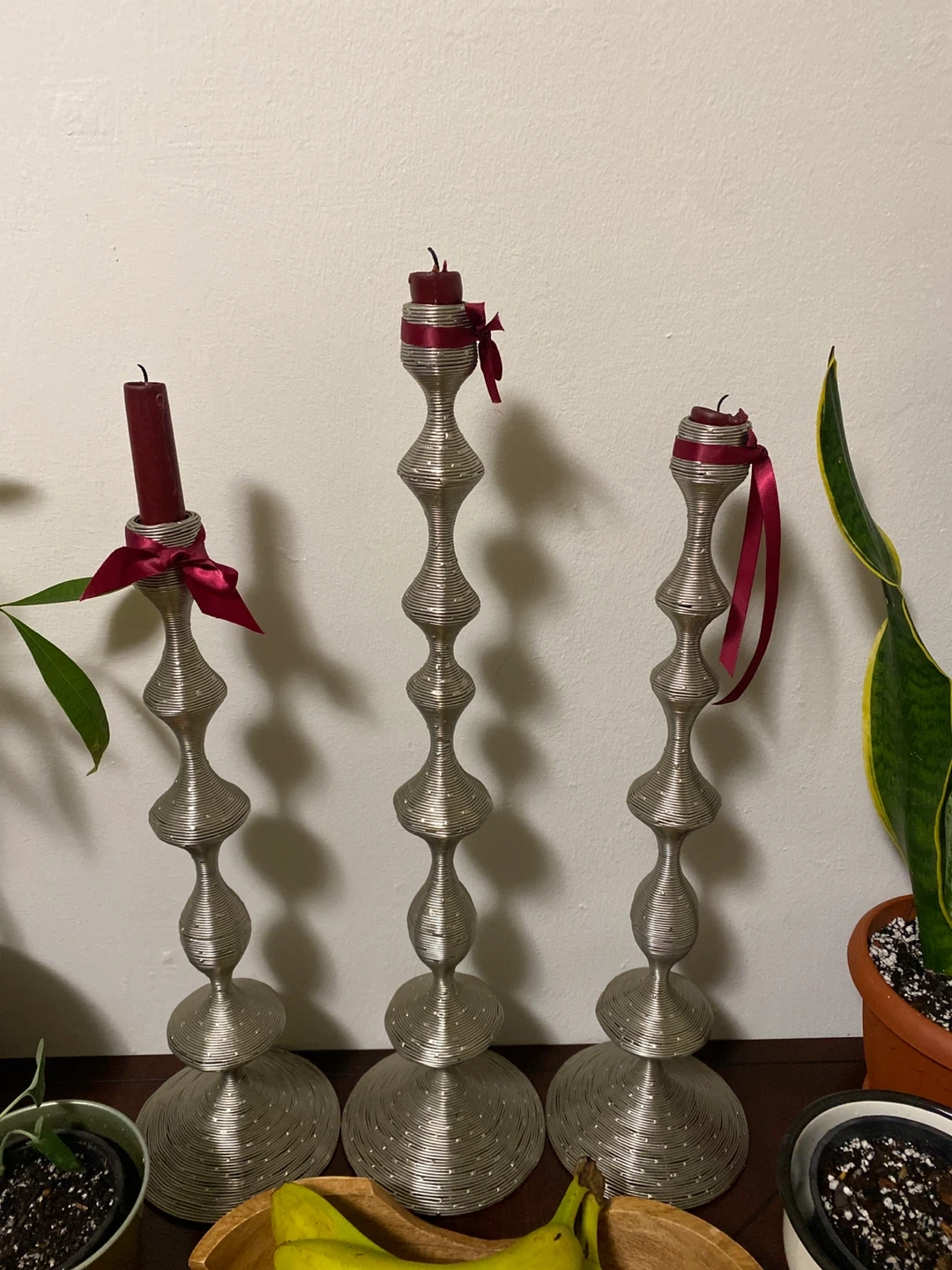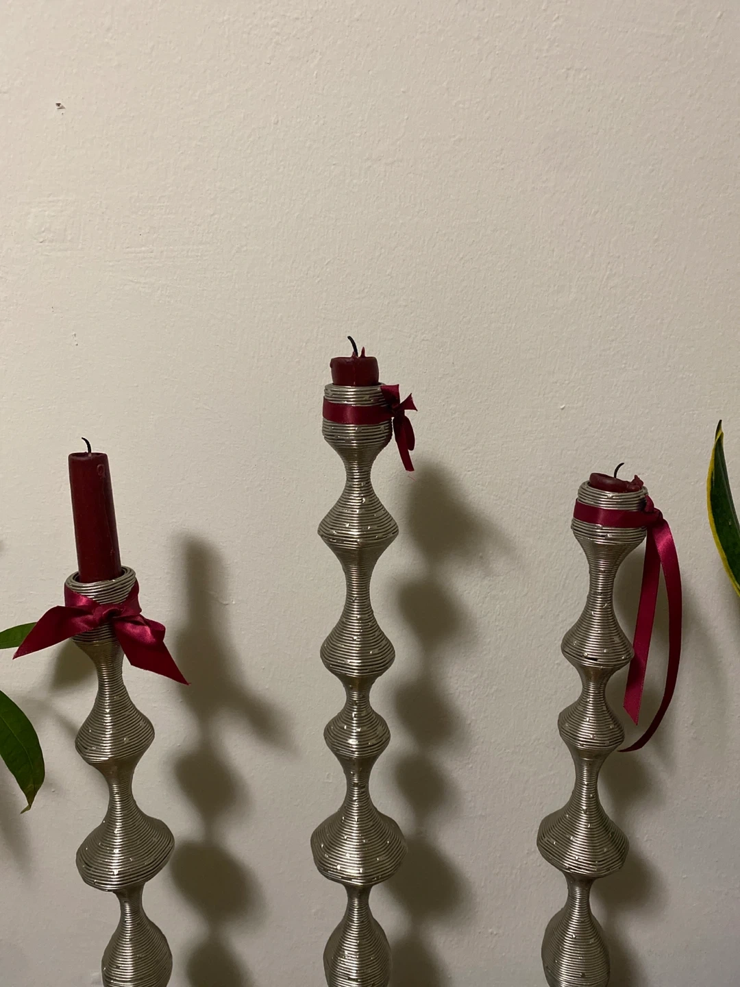 Here's a set of three silver metal candlestick holders! They have a unique, eye-catching design that would look great in any room. Perfect for adding a touch of elegance to your home decor