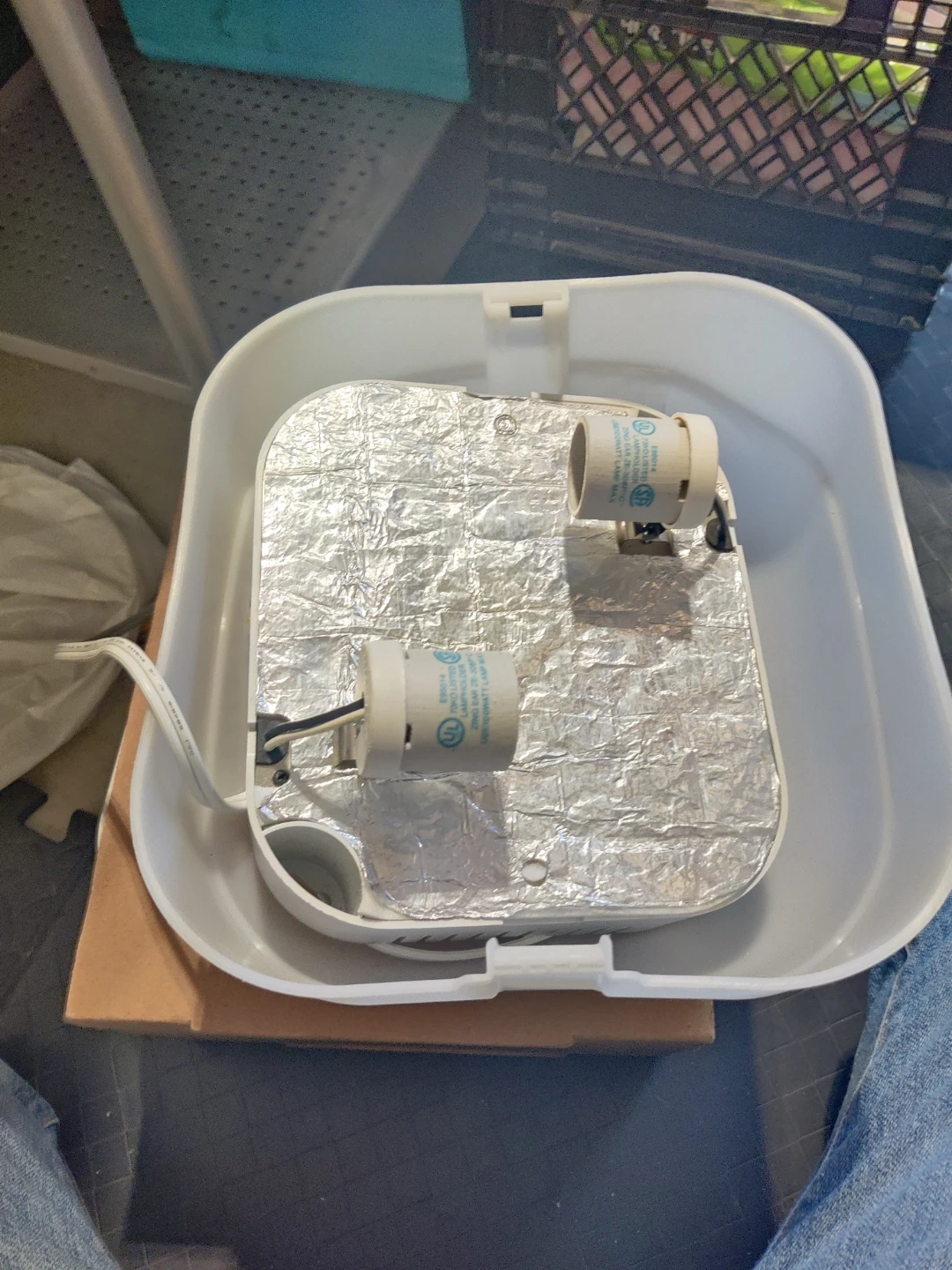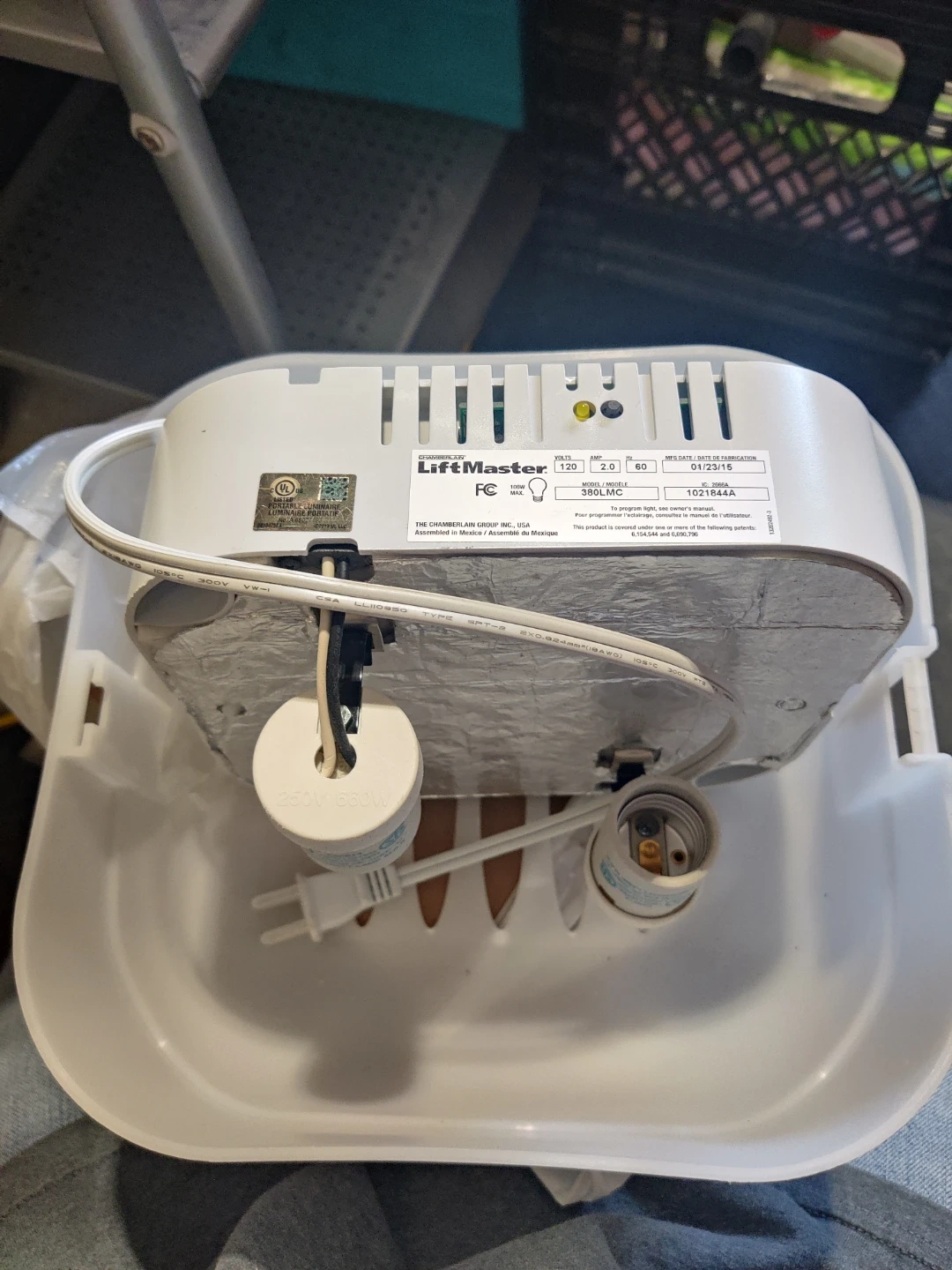 This is a LiftMaster light fixture for a garage door opener. It has two sockets for light bulbs. The unit includes the plastic cover. It's made of plastic.