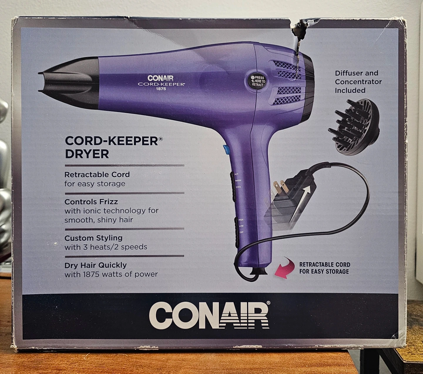 Selling a Conair Cord-Keeper 1875 dryer! It comes with a diffuser and concentrator attachment. The dryer features a retractable cord for easy storage, ionic technology to control frizz, and custom styling with 3 heat and 2 speed settings. It's a great dryer with 1875 watts of power