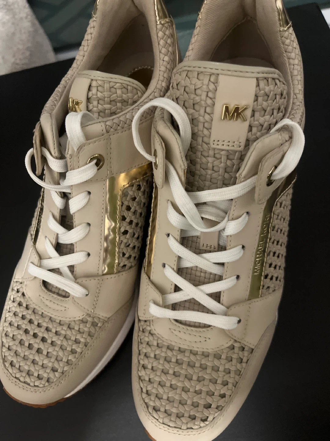 Selling a pair of Michael Kors sneakers in a lovely beige colour. They feature a stylish woven design and gold accents. Perfect for adding a touch of elegance to your casual outfits!