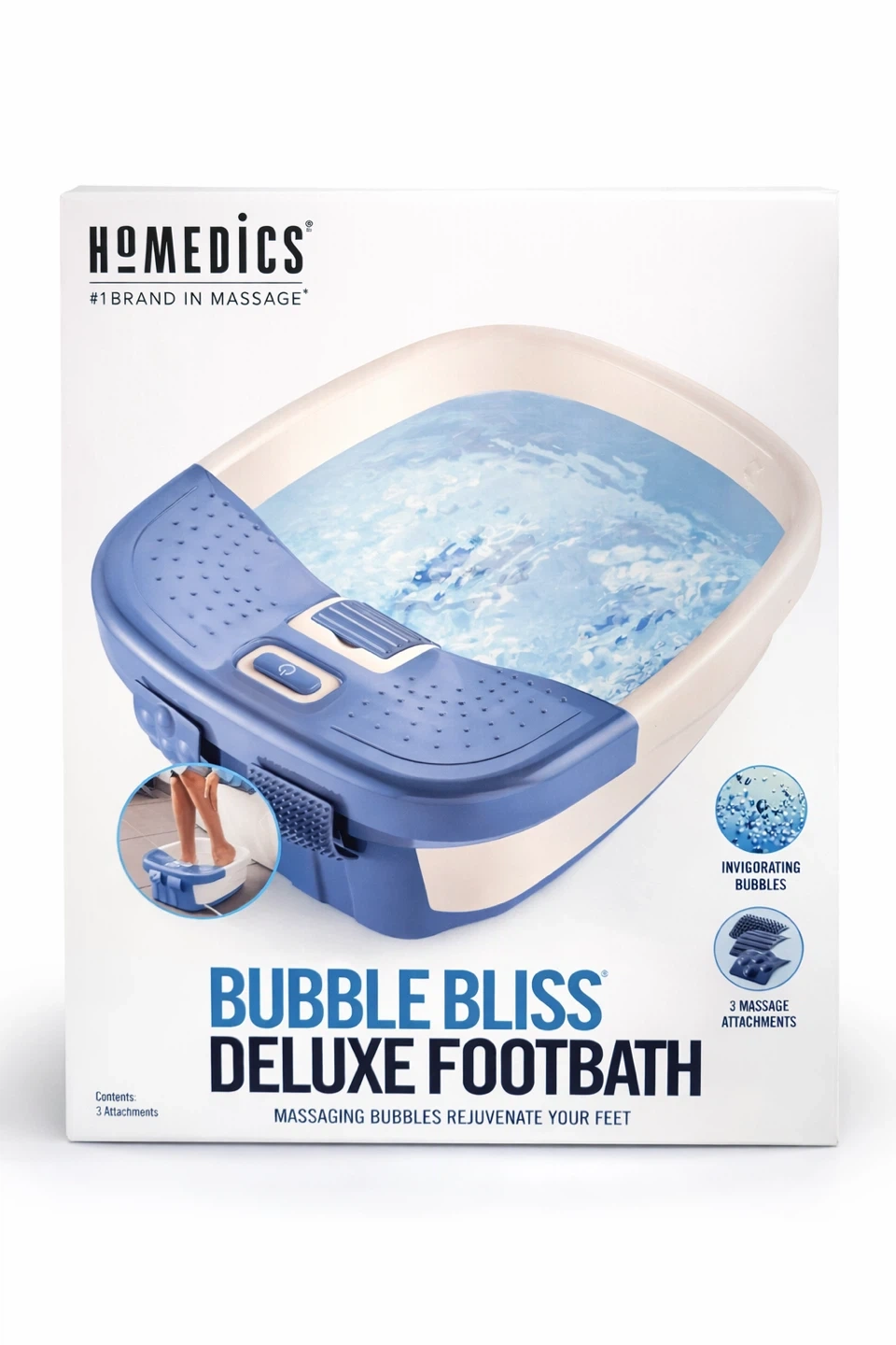 HoMedics Bubble Bliss Deluxe Footbath with invigorating bubbles. It comes with 3 massage attachments. Enjoy a relaxing foot soak with massaging bubbles that rejuvenate your feet.