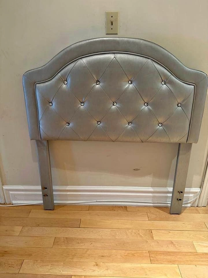 Modern silver headboard, new in box! Never assembled. Easy setup for a twin bed, perfect for creating a stylish girls' room, teen room, or guest room. Size: 47.25'' H X 58'' W X 3.75'' D. PICKUP ONLY.