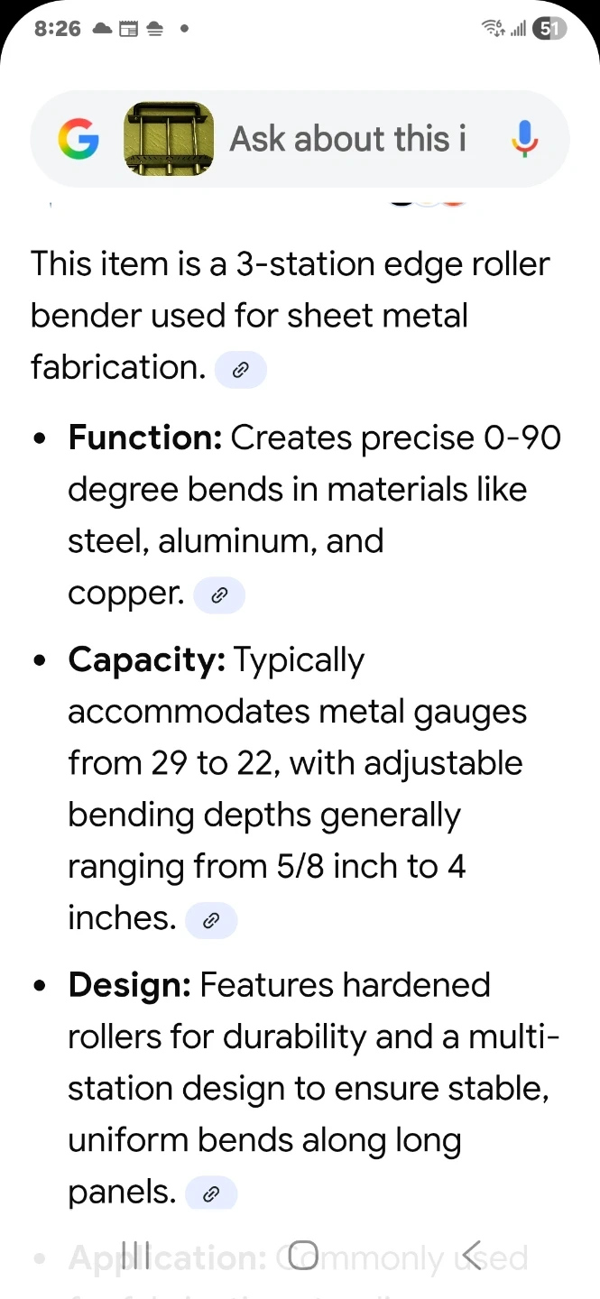 This is a three-station edge roller bender for sheet metal fabrication. It creates precise 0-90 degree bends in steel, aluminum, and copper. Its design features hardened rollers for durability and a multi-station setup for stable bends. This bender is useful for fabricating standing seam metal roofing and garage rain deflectors.