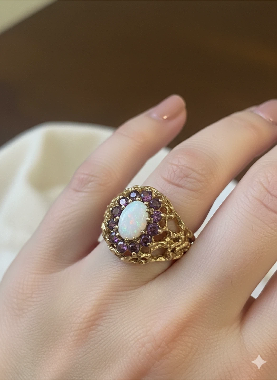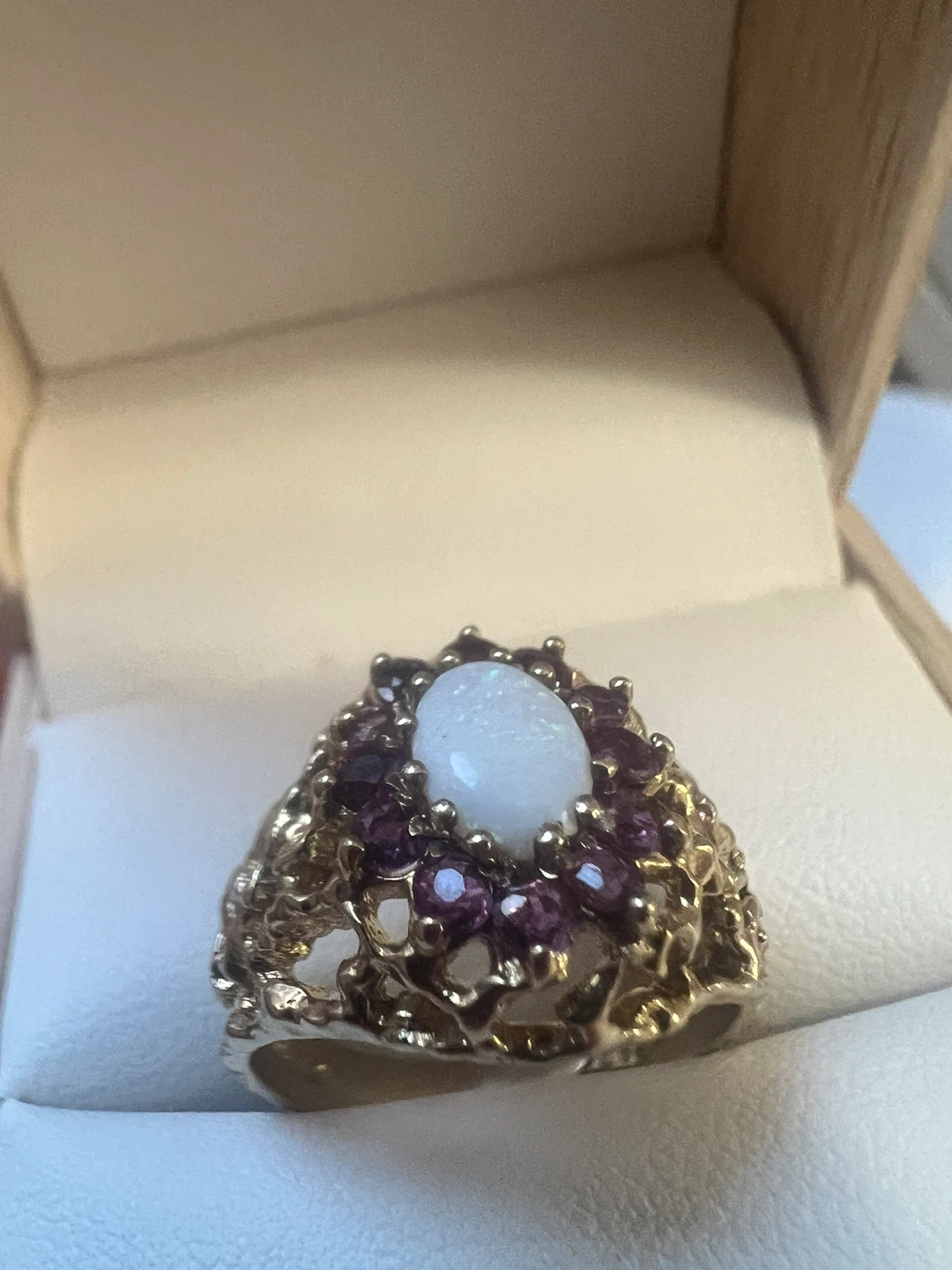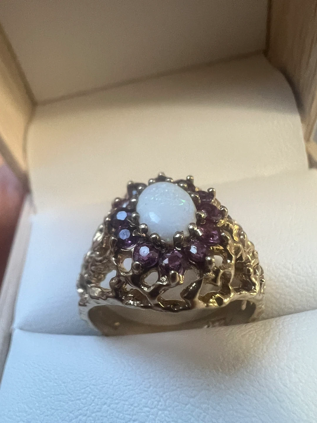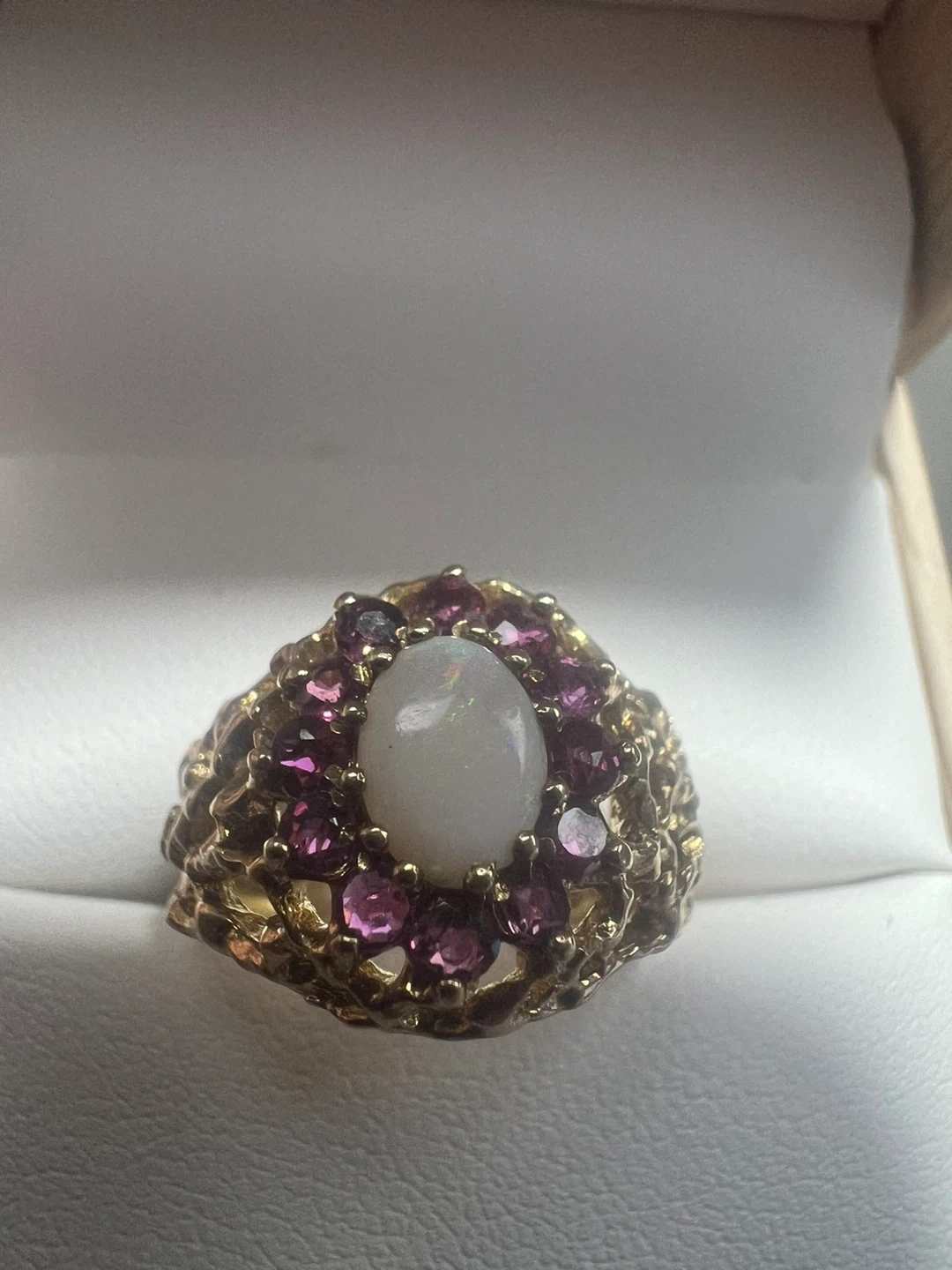 A stunning 10 k gold ring featuring a central opal surrounded by rubies . This unique piece showcases intricate metalwork. The appraisal certificate dates it to January 22, 2026, with a replacement value of $1,547.00.