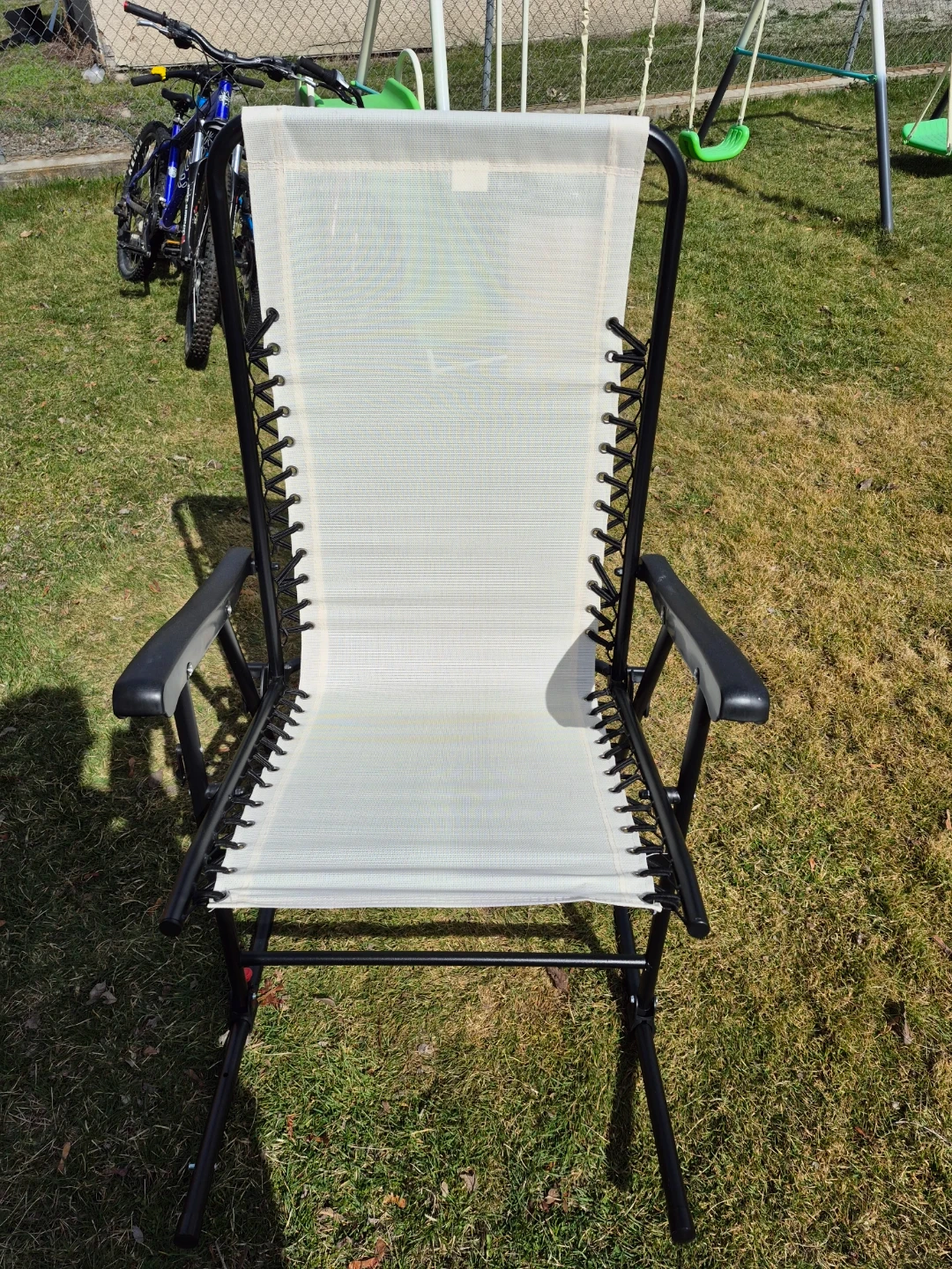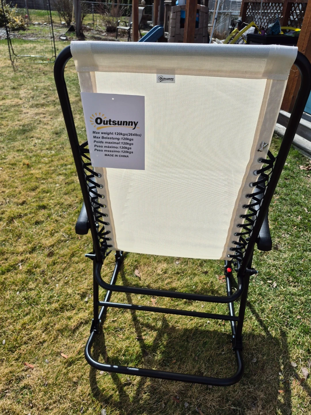 This Outsunny foldable rocking chair is made with a breathable mesh fabric and has a padded headrest. It's designed for outdoor use and supports up to 120 kgs. It folds for easy storage and transport.
