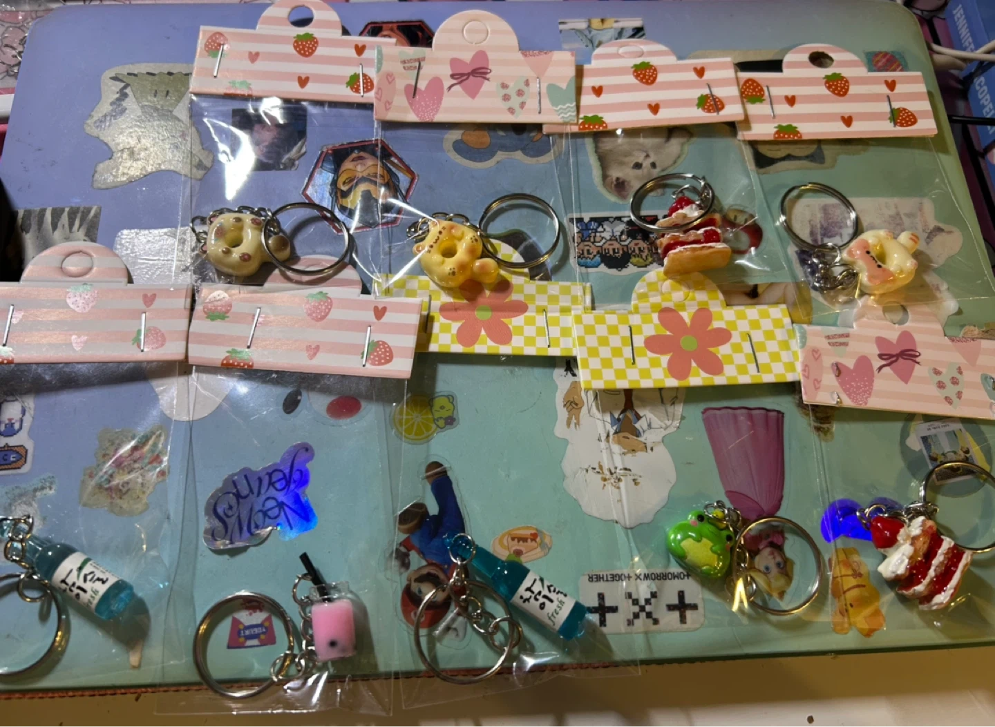 Cute collection of miniature keychains! Includes donuts, a boba drink, a slice of cake, and various cartoon characters. These little accessories add a fun touch to bags or keys.