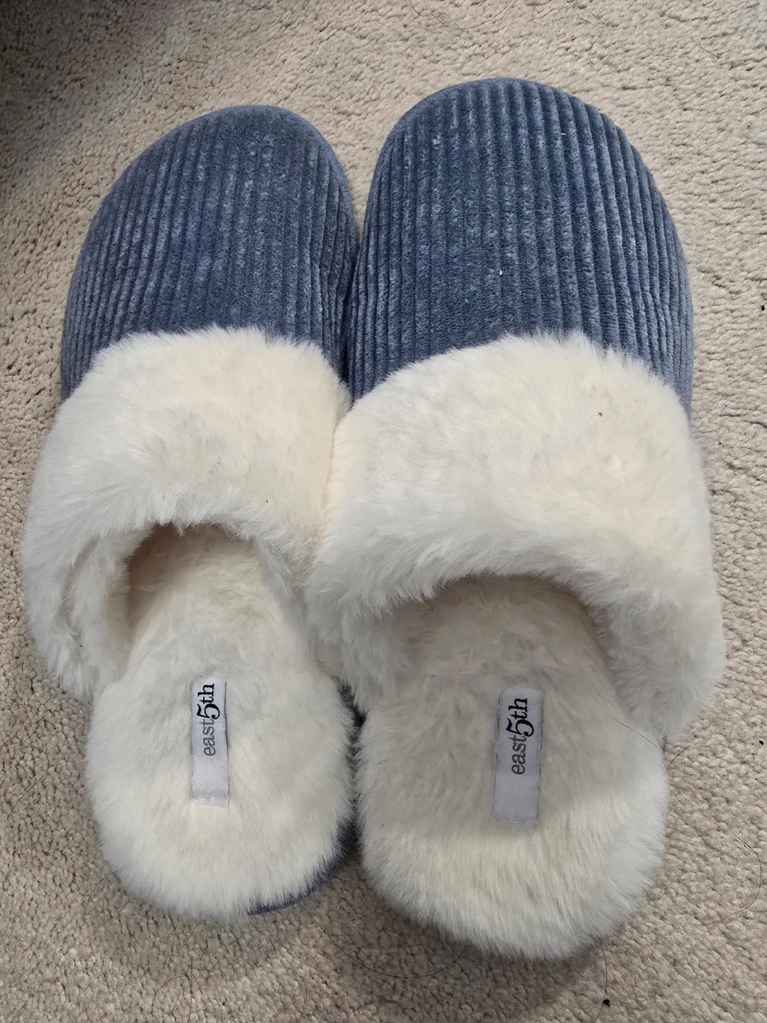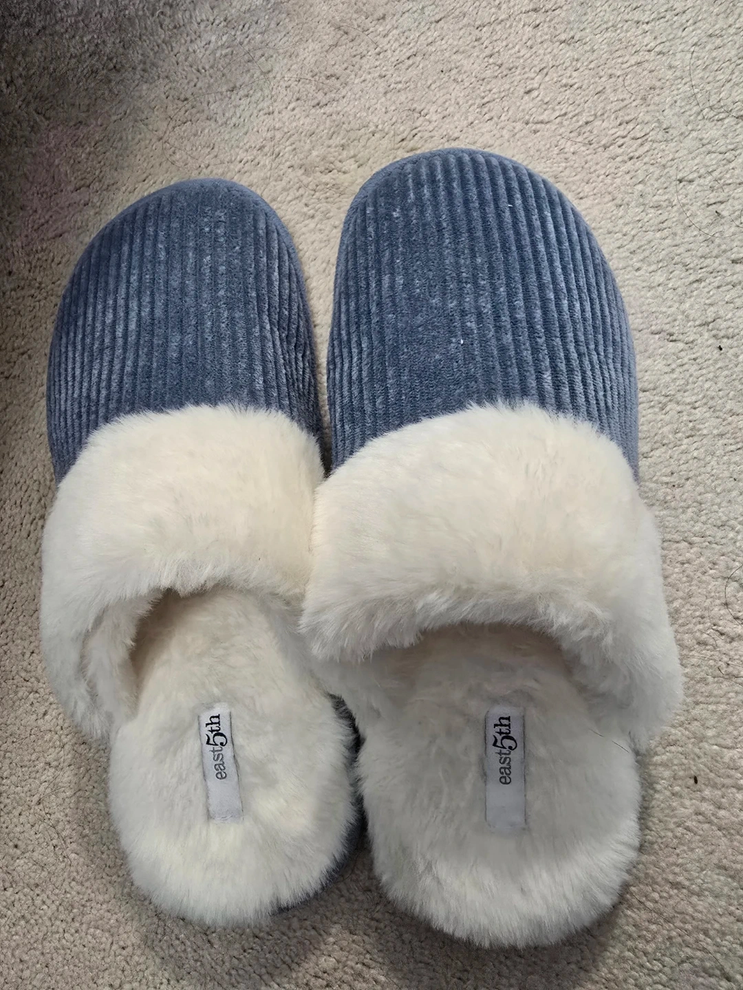 Comfy blue corduroy slippers with a plush white trim. Soft faux fur lining for warmth. Easy slip-on style for cozy evenings at home!