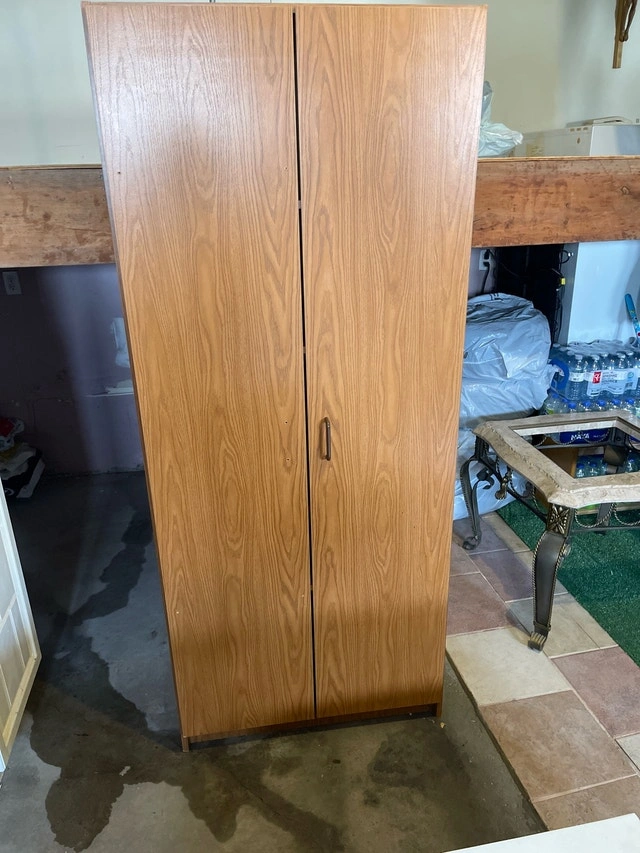 This is a used wardrobe with a traditional wood finish. It stands approximately 6 feet tall and offers ample storage with multiple shelves inside. It's perfect for organizing clothes or other household items. The dimensions are as follows: Height: 72 inches, Depth: 16 inches, Width: 31 inches. While it has been a reliable piece of furniture, I'm making space in my home and hoping it finds a new purpose elsewhere. If you're seeing this ad, it means the wardrobe is still available. Cash accepted.