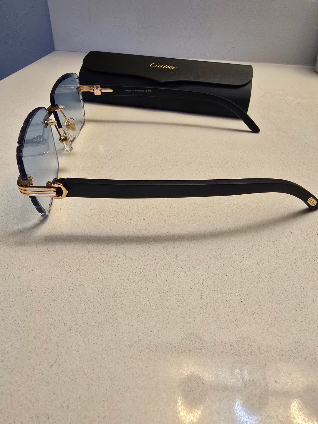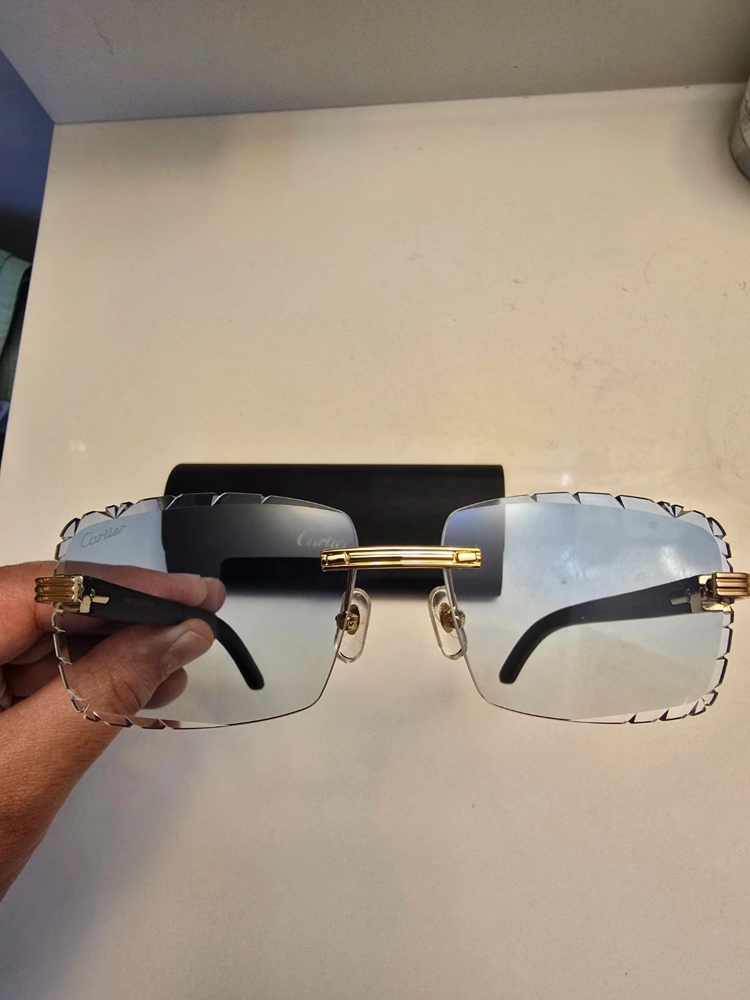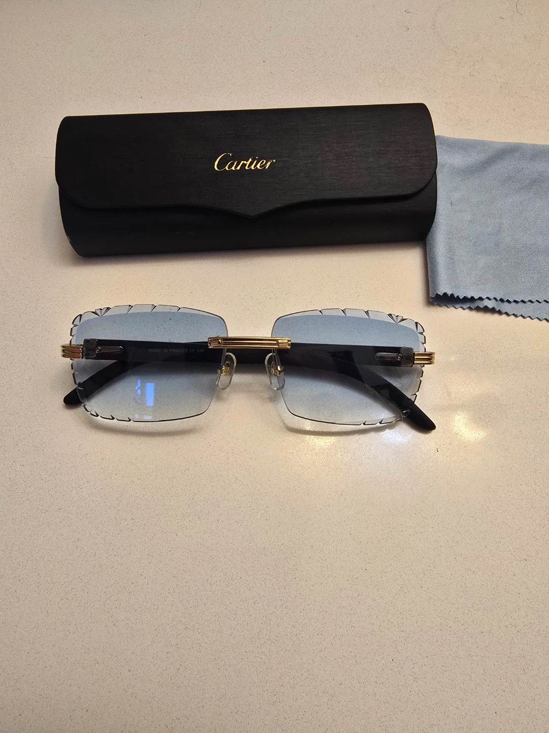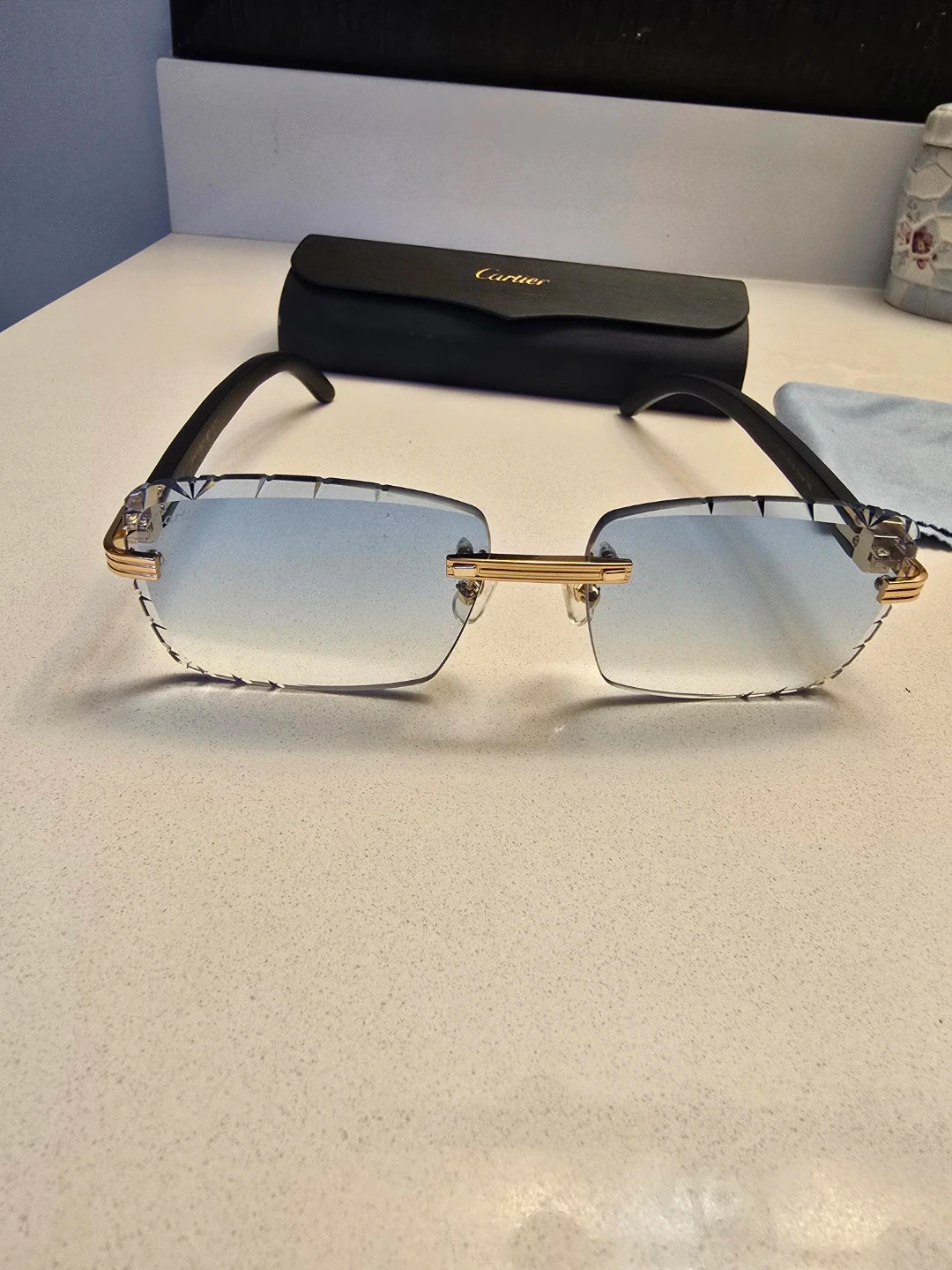 Cartier rimless sunglasses with gradient blue lenses. Gold-toned hardware and black acetate arms. Includes original case . Made in France.