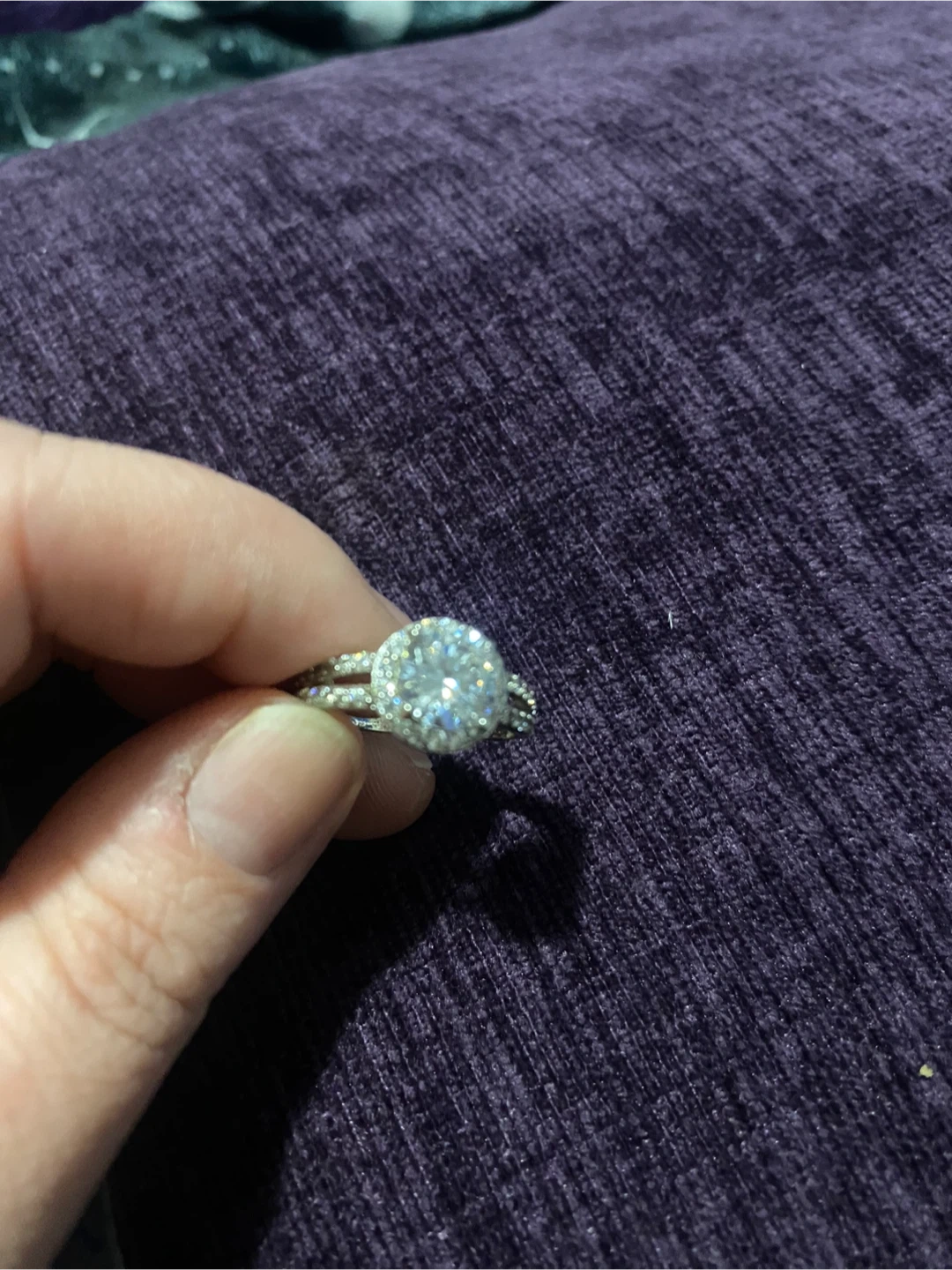 Beautiful engagement ring featuring a large centre stone surrounded by a halo of smaller stones. The band is also adorned with pave-set diamonds. It's a truly eye-catching piece!