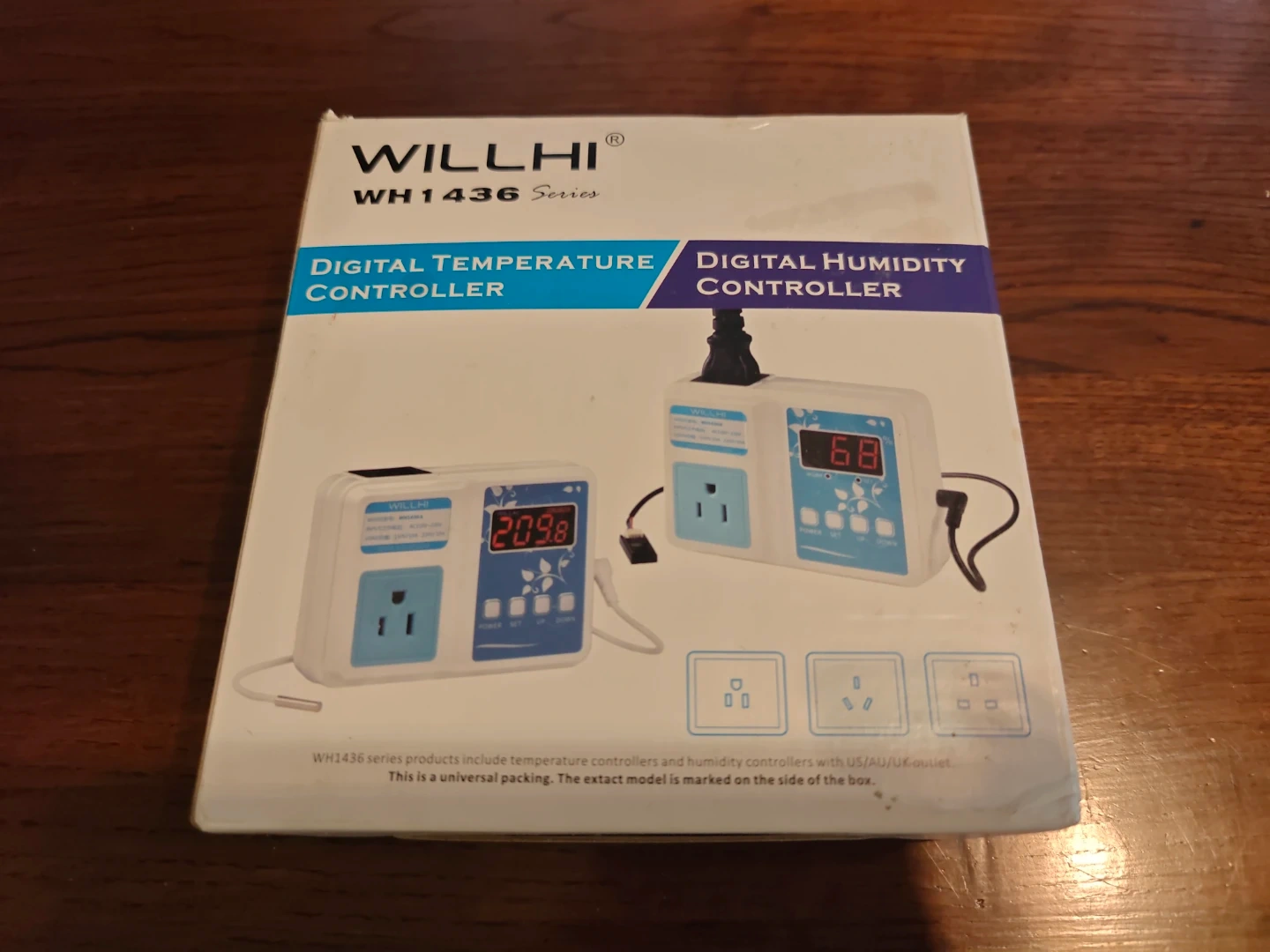 This WILLHI WH1436 Series unit functions as both a digital temperature and humidity controller. It's designed for universal plug use. The device features clear digital displays for temperature and humidity readings.