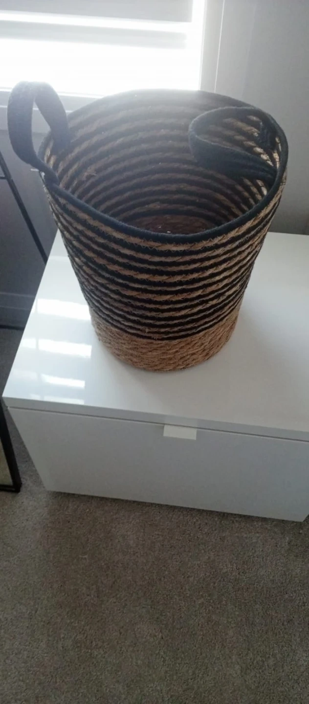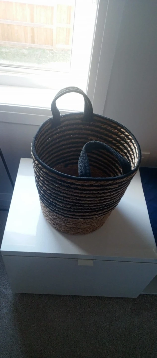 Woven basket with black and natural stripes. It has two sturdy handles for easy carrying. Perfect for blankets, toys, or general storage in any room!