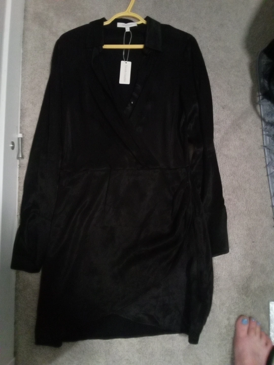 This is a Favorite Daughter The Dinner Party Dress in black. Size is 6. Made with a sueded satiny fabric with a wrapped silhouette and long sleeves.