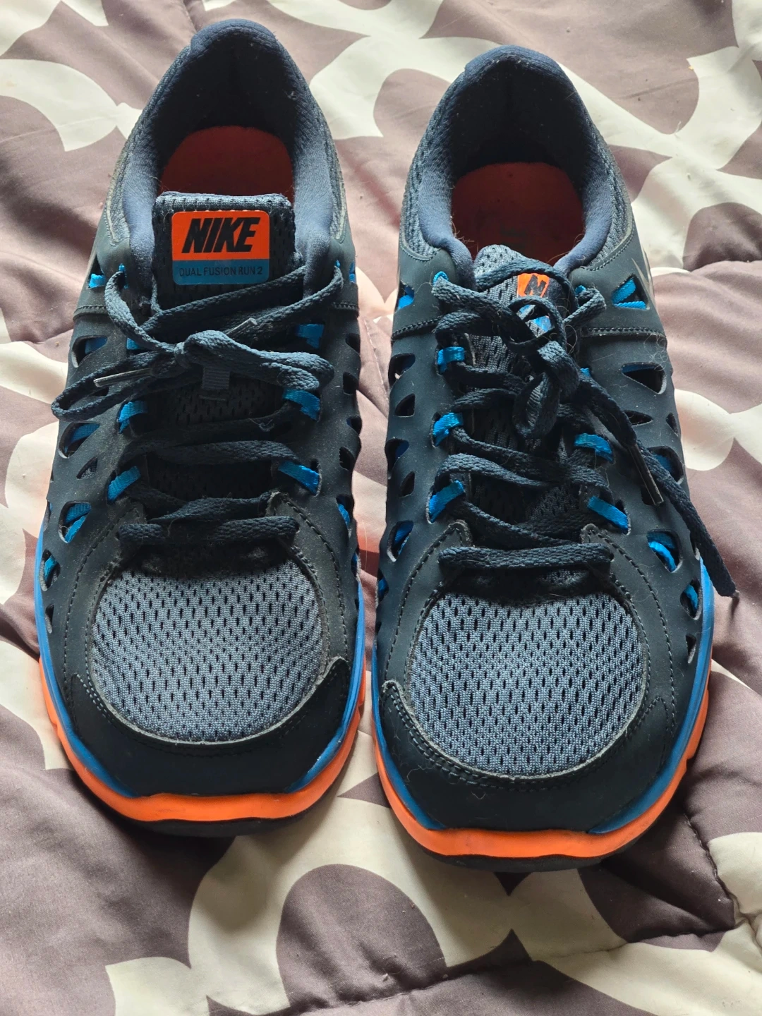 Selling a pair of Nike Dual Fusion TR 4 running shoes in men's size 10.5. The shoes feature a navy blue and orange colour scheme. Great for running or casual wear!