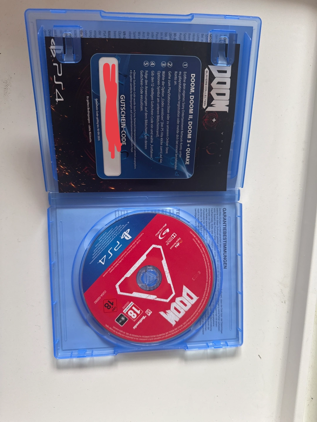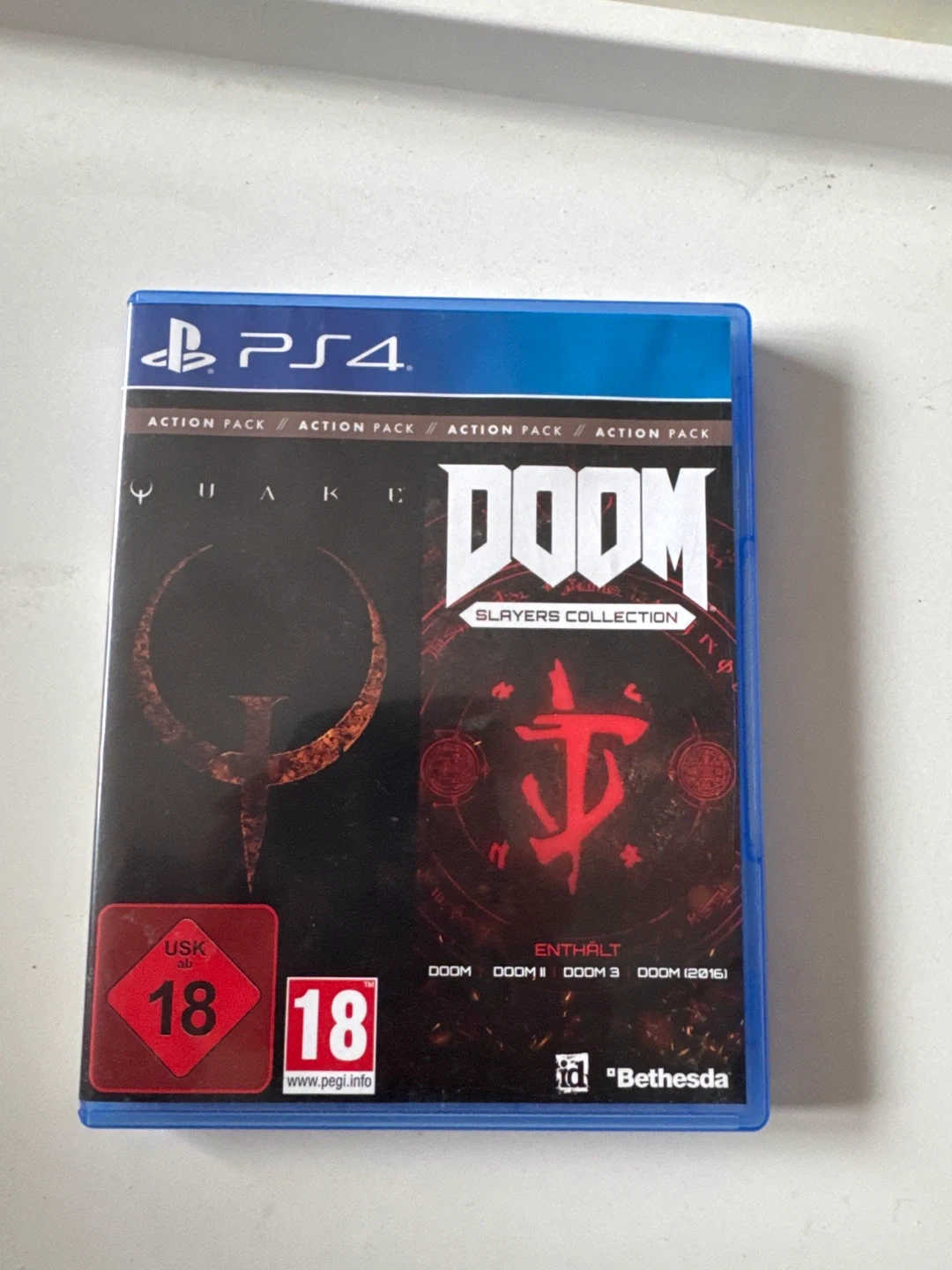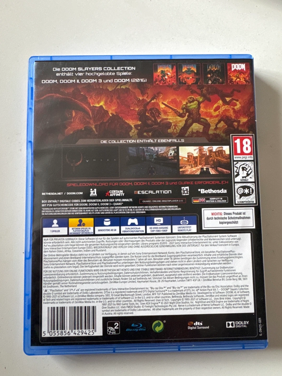 This PlayStation 4 game collection includes DOOM, DOOM II, and DOOM 3 (2015). It also contains a voucher code for Quake, online multiplayer, and remote play. The game is rated 18+.