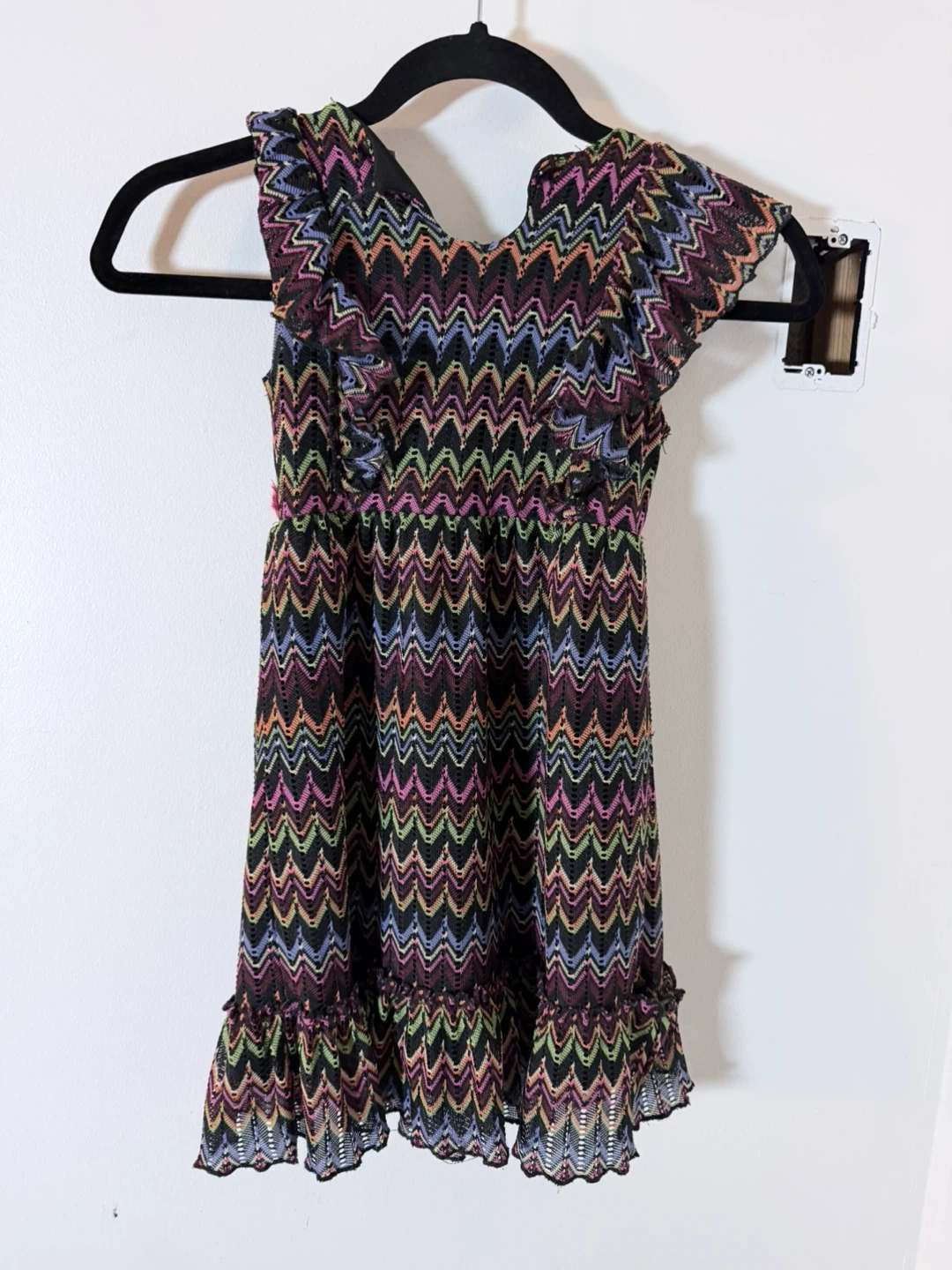 A Nanette Nanette Girl dress in size 6. It's made of 100% polyester and features a colourful chevron pattern with ruffled details and a pink bow. Perfect for a little one's wardrobe!