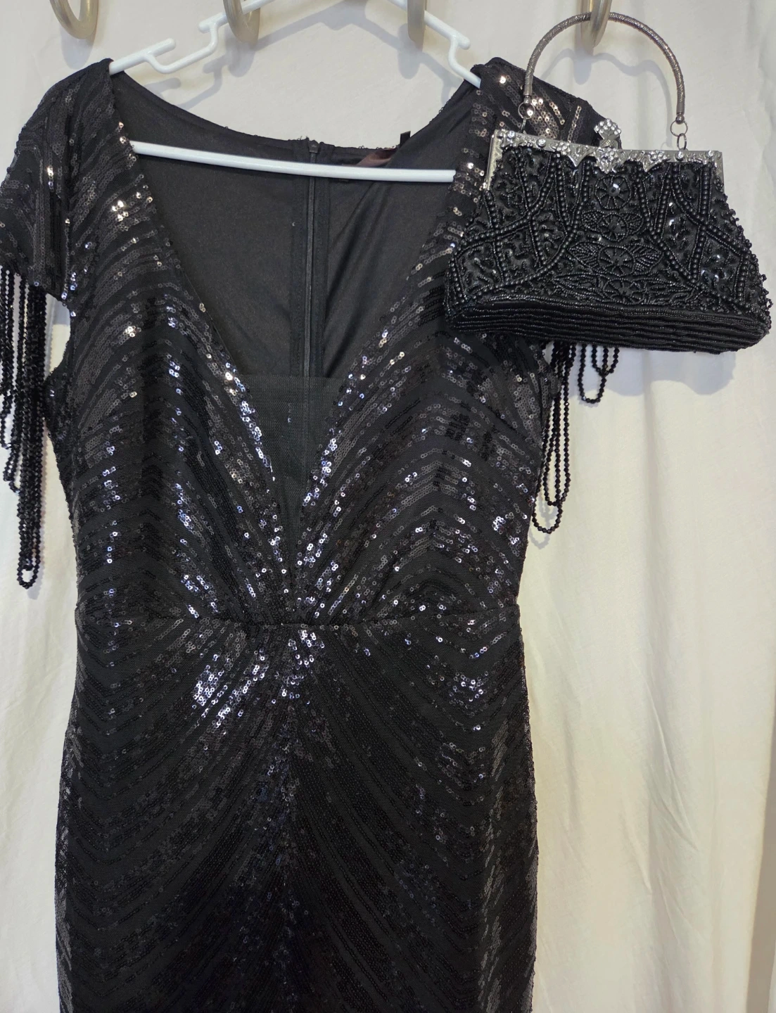 BABEYOND TRULY TIMELESS. Selling a beautiful black sequin dress that comes with a matching beaded purse! The dress has a flattering V-neckline and is covered in shimmering sequins. The beaded purse complements the dress perfectly, making it a stunning set for any special occasion.