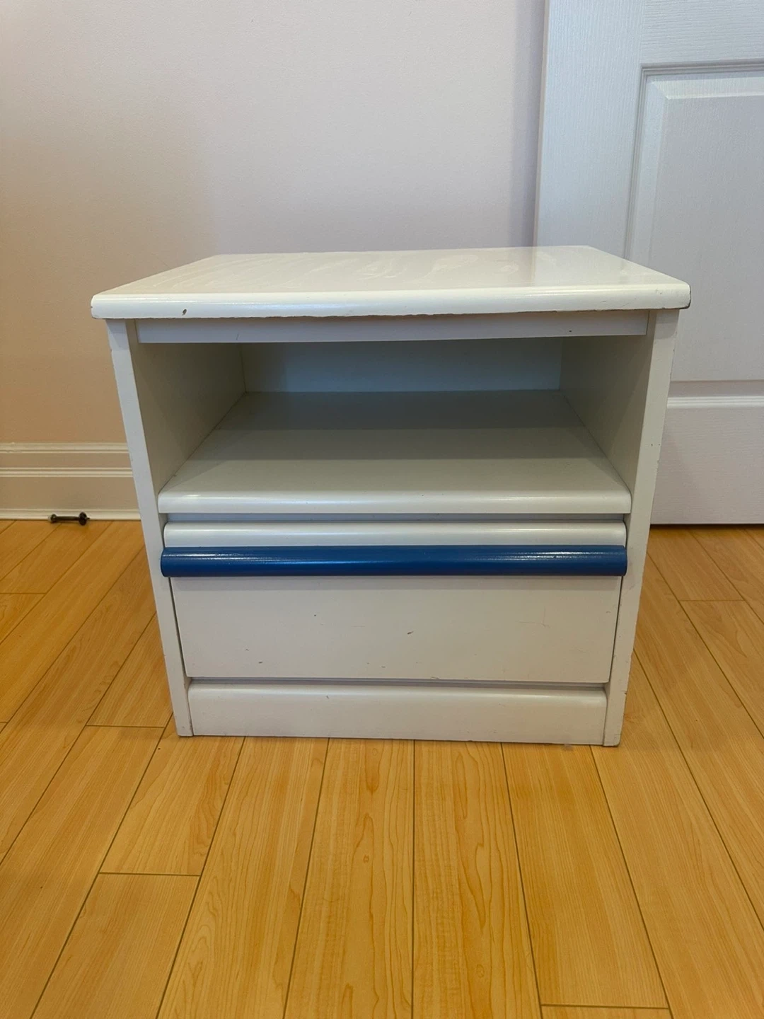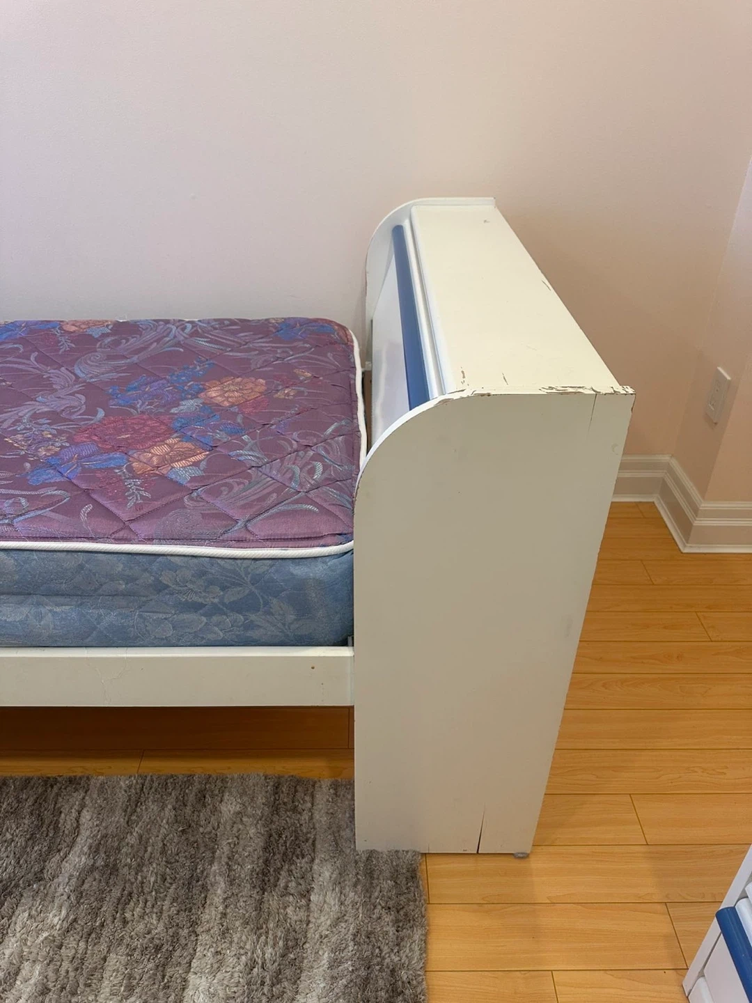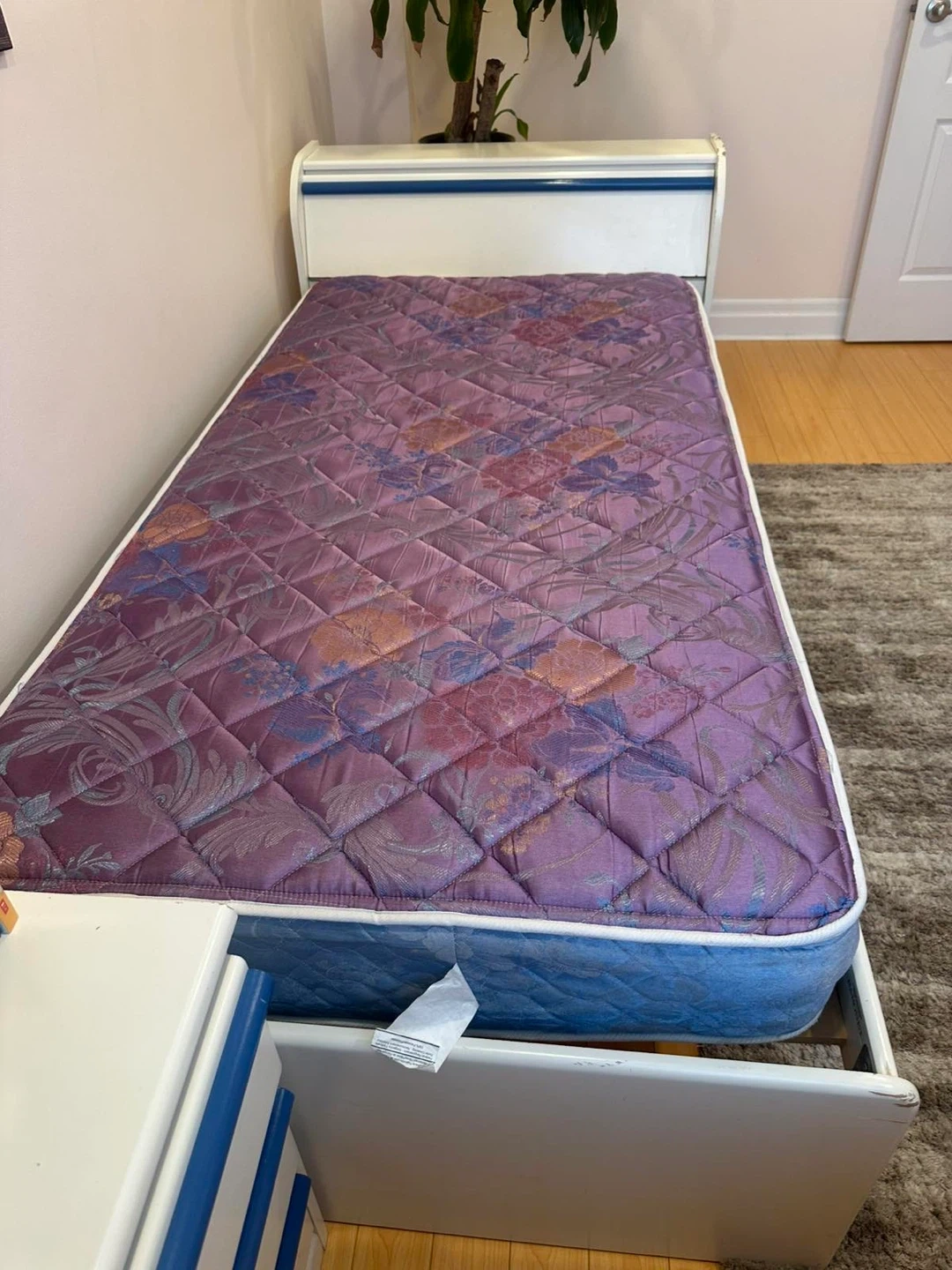 White single bed frame with a blue trim detail and matching nightstand. It comes with a patterned mattress and a particle board base. The nightstand features a drawer and an open shelf. Bookcase is in perfect condition.