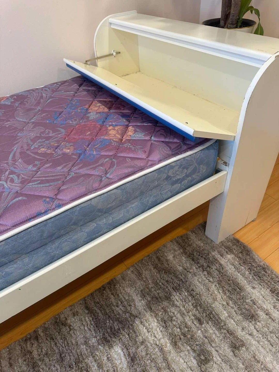White Single Bed Frame with Mattress and Nightstand
