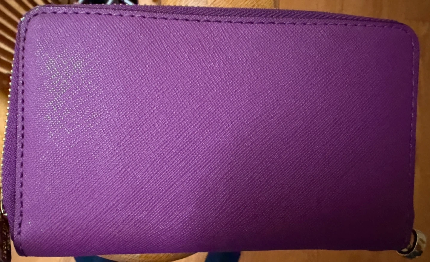 A vibrant purple Michael Kors zipper wallet. It's made from textured leather and has multiple card slots inside. Perfect for organizing your essentials!