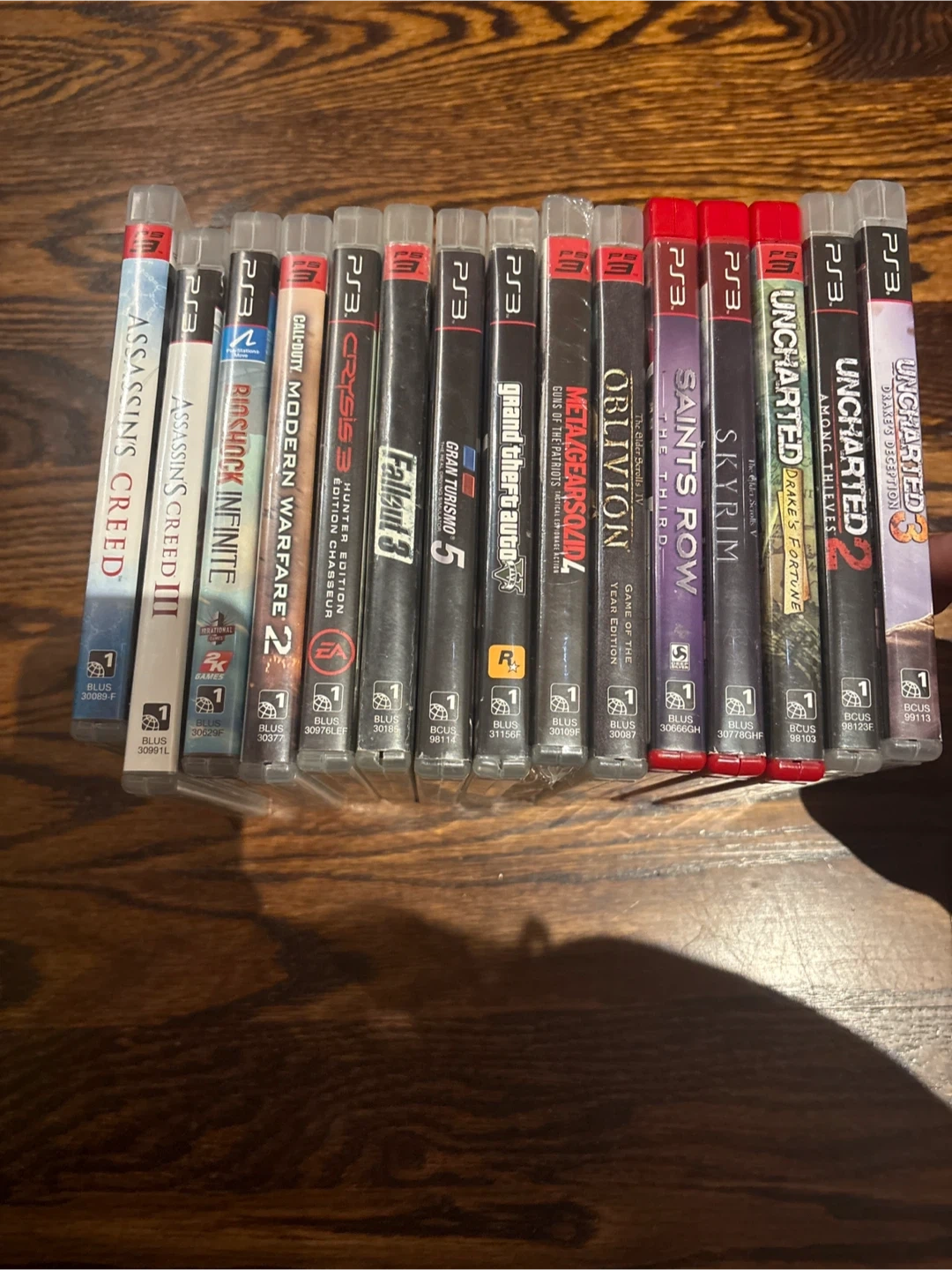 Selling a collection of 15 PlayStation 3 video games. Titles include Assassin's Creed III, Assassin's Creed, BioShock, Crysis 3, Fallout 3, Gran Turismo 5, Grand Theft Auto V, The Elder Scrolls IV: Oblivion, Saints Row: The Third, The Elder Scrolls V: Skyrim, and Uncharted 1-3. And the PS3 console itself. Can be purchased individually or as a lot.
