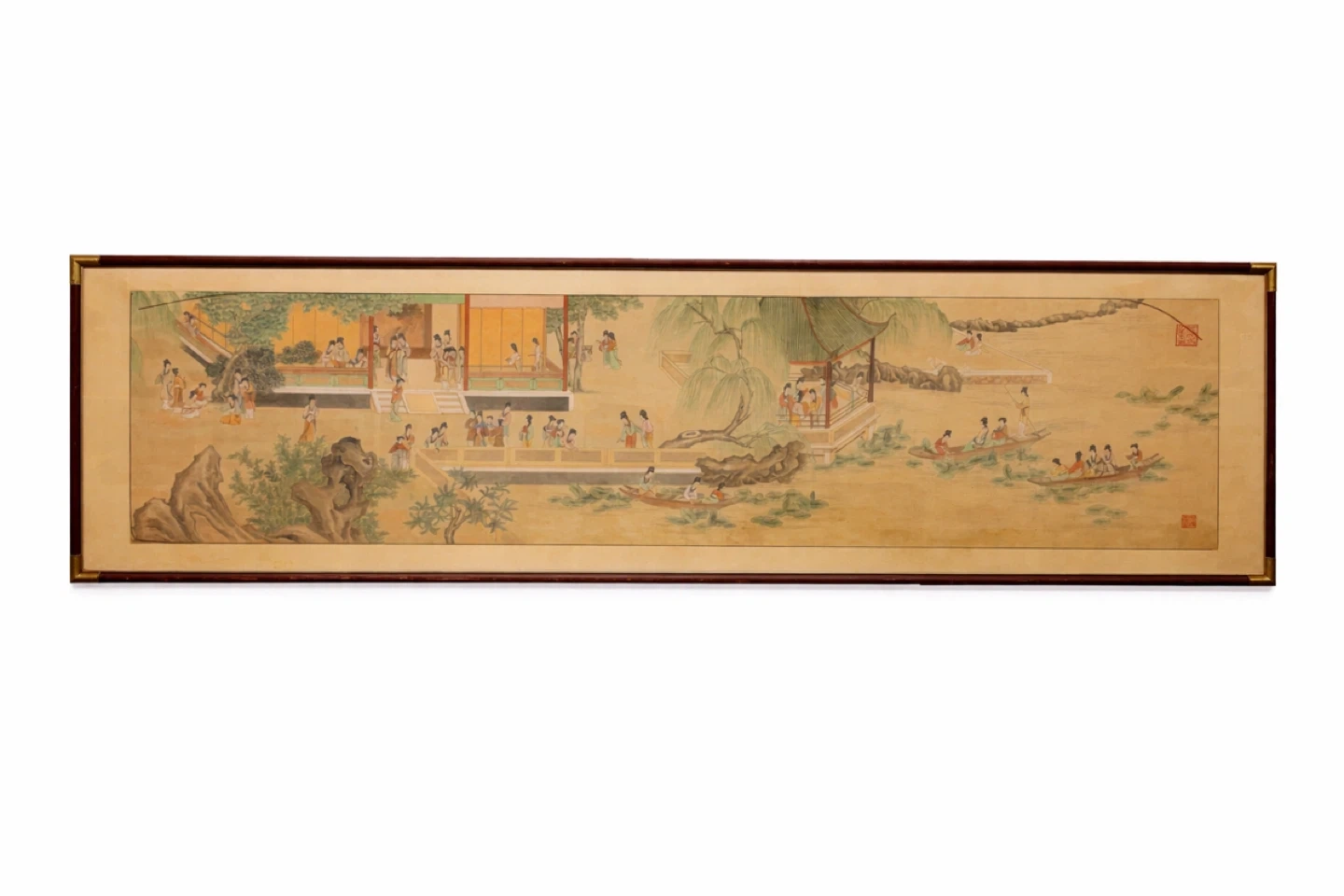 Framed Asian Art Painting with Figures and Water Scene