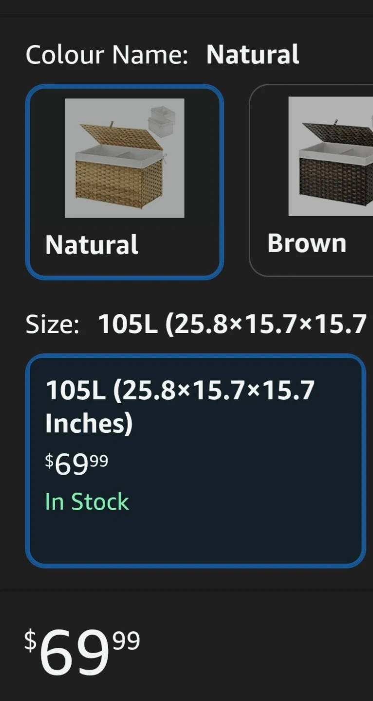 This is a Greenstell 105L handwoven storage basket with a lid. It features a cotton liner and a metal frame. The basket is natural in colour and measures 25.8x15.7x15.7 inches. It's foldable and includes a handle for easy carrying.