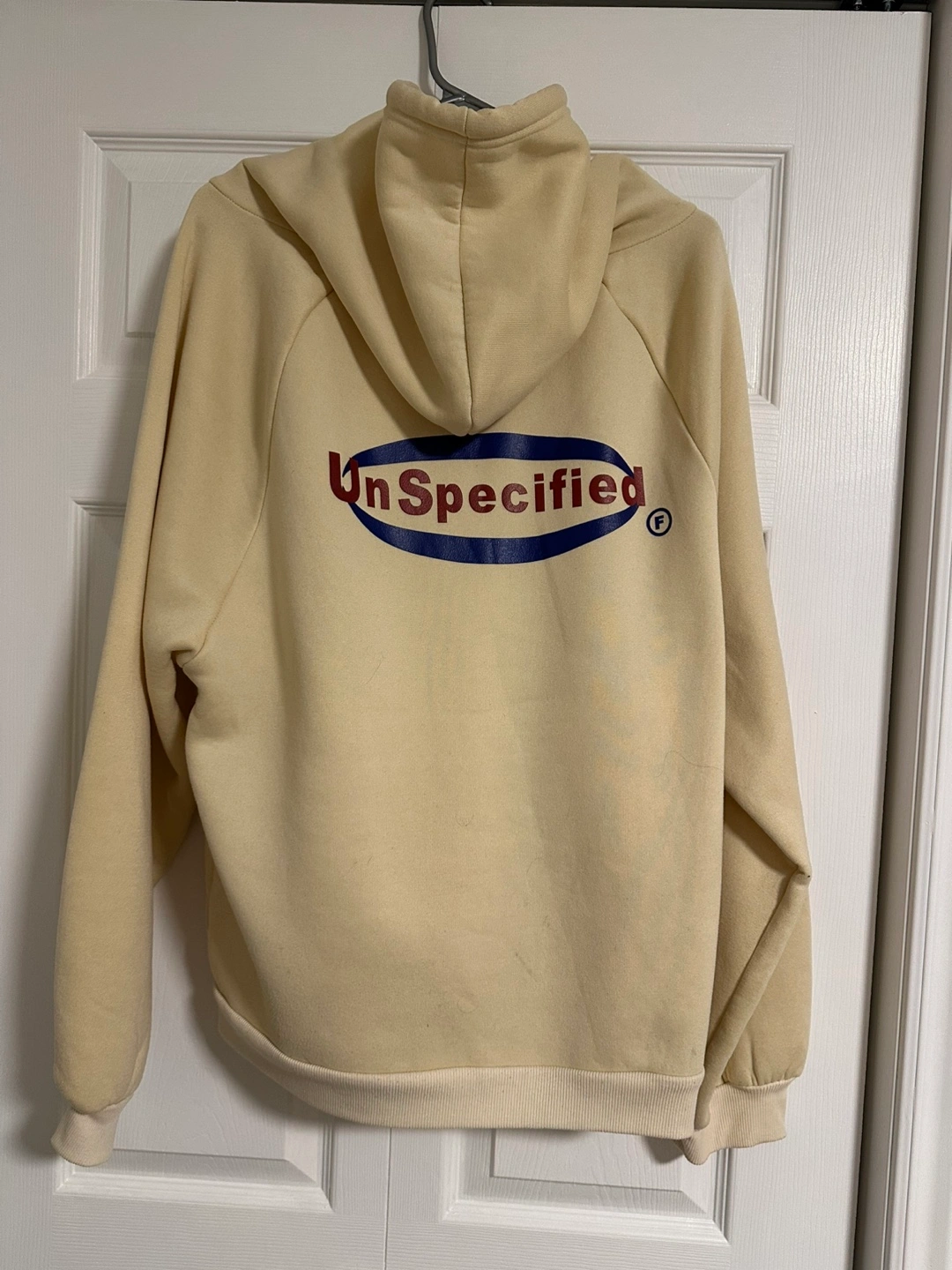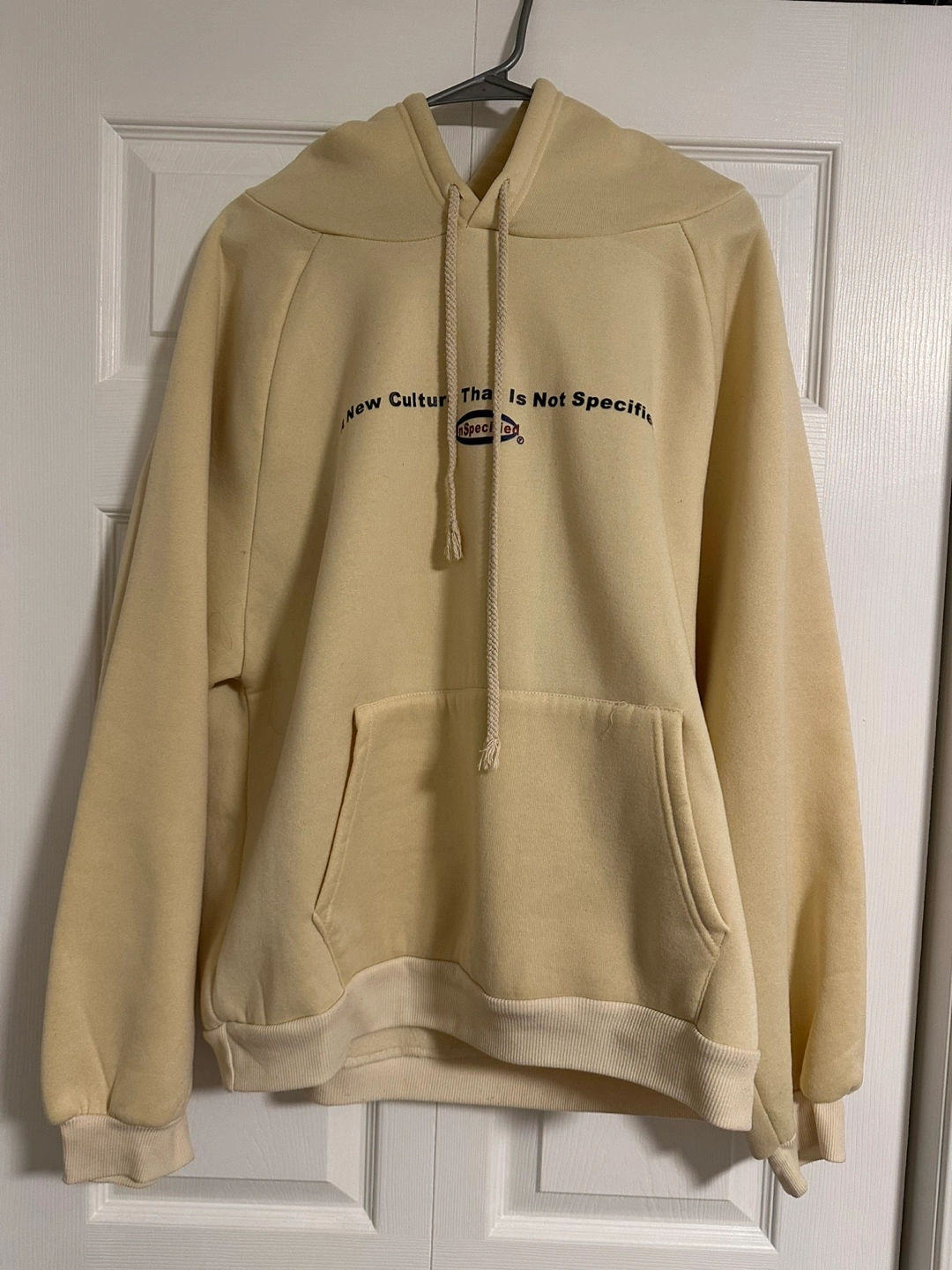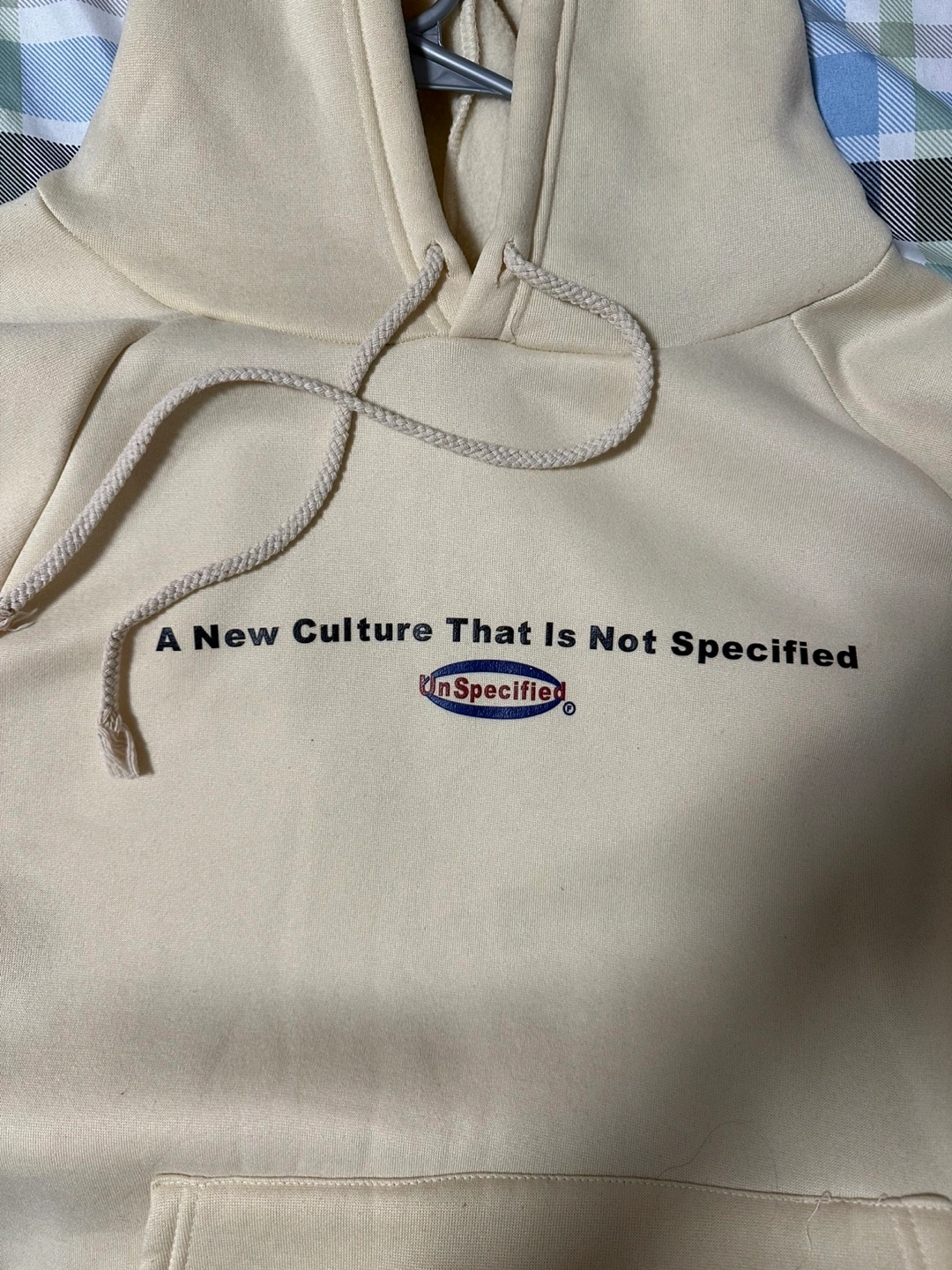 Creamy hoodie with the words "A New Culture That Is Not Specified" printed on the front and "UnSpecified" on the back.